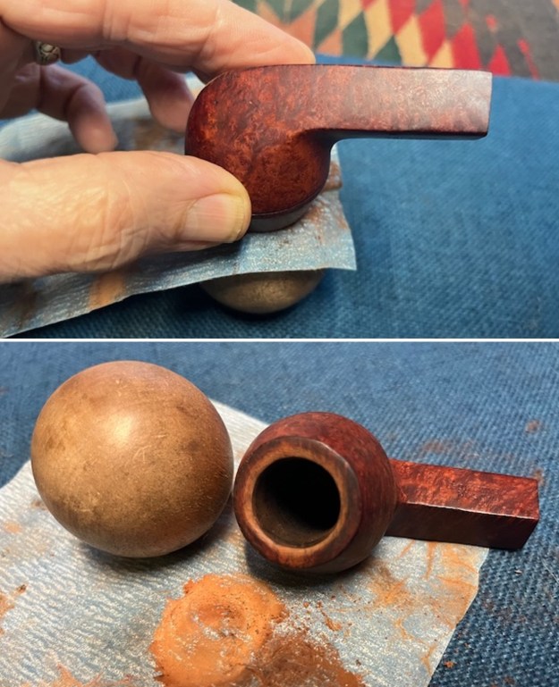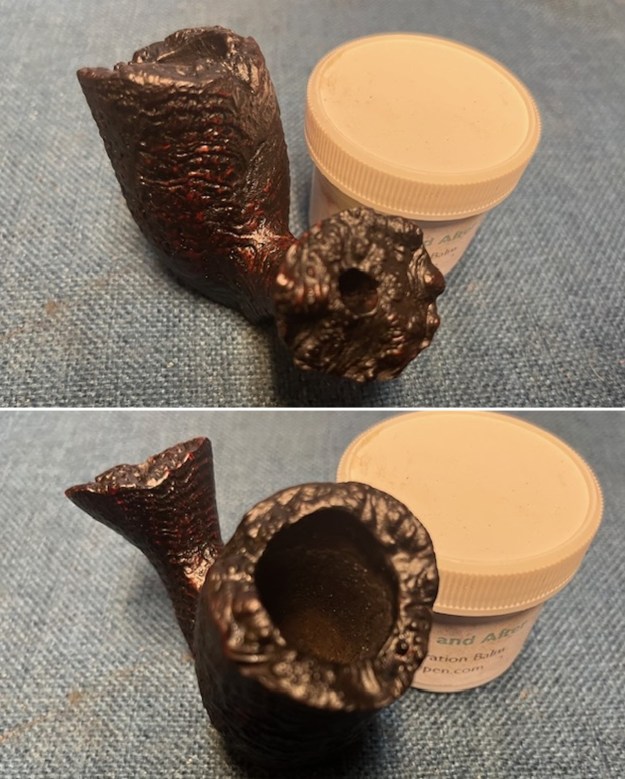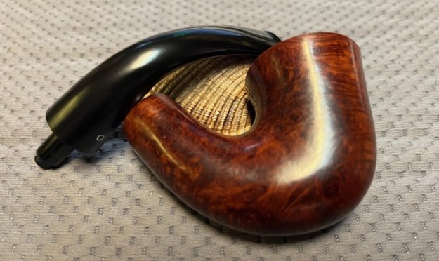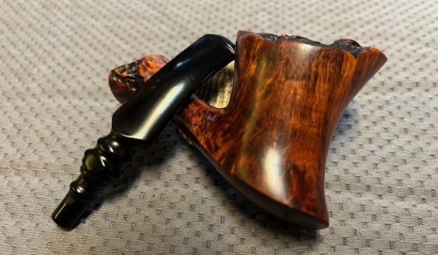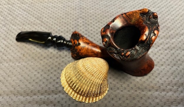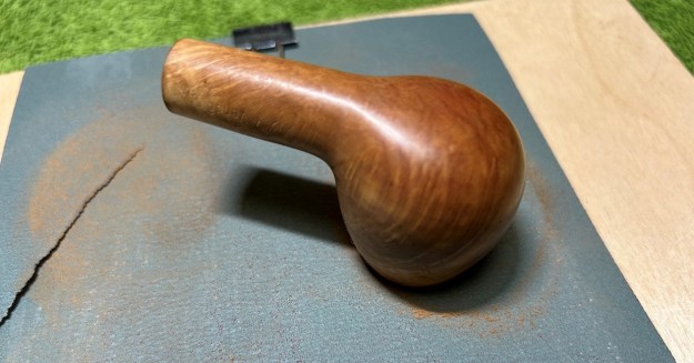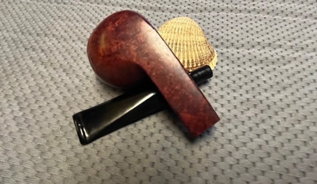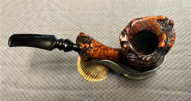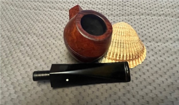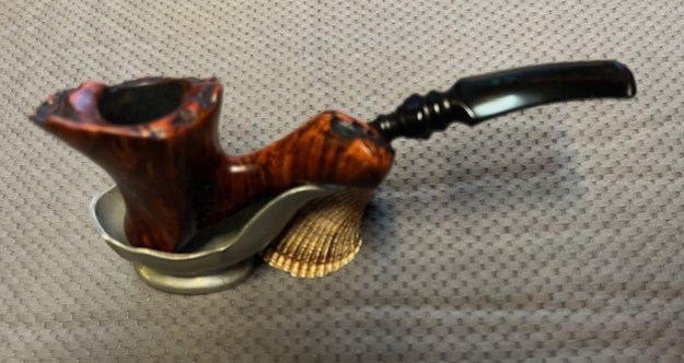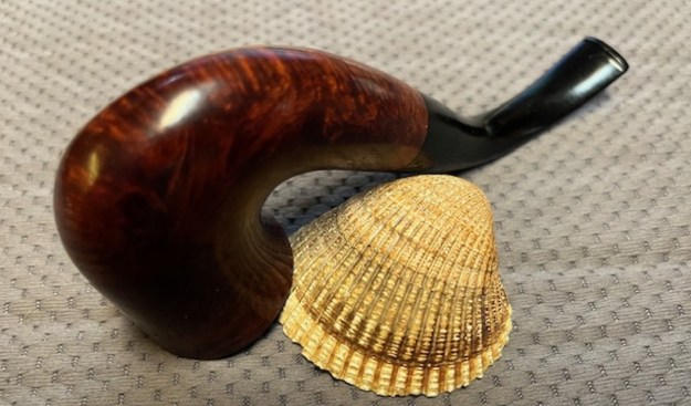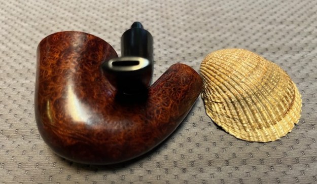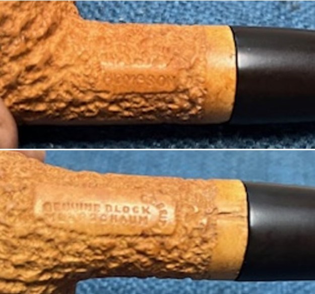 I took a photo to try and capture the stamping on the shank side. It was faint but readable. I also removed the stem and took a photo of the pipe sans stem to show the proportions of this unique beauty. There also appears to be a small flaw/crack just below the NM of Danmark. I will need to check that out.