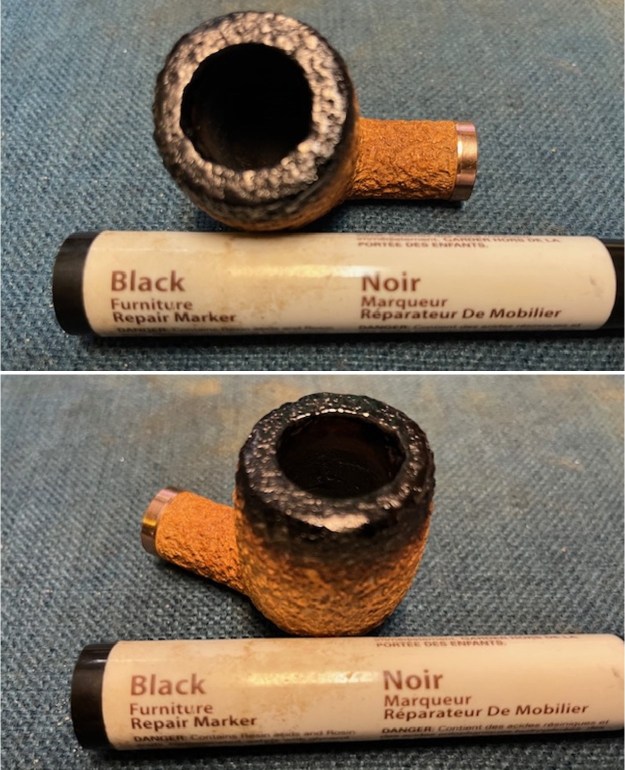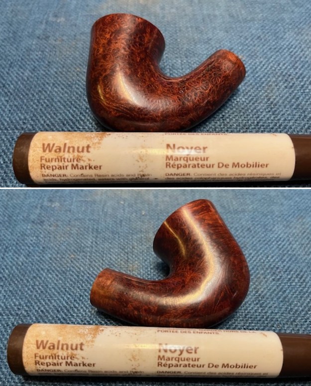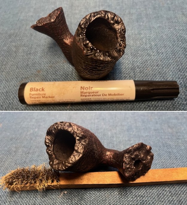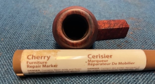 I decided to start with examining the pipe for any issues in the briar. I found a small flaw in the shank come from the plateau end up to the N and M in Danmark. I filled it in with CA glue carefully applied with a tooth pick I sanded it smooth with 220 grit sandpaper and then with 1500-2400 grit micromesh. I restained the area with a Cherry stain pen to match the surrounding area. It looked much better.
