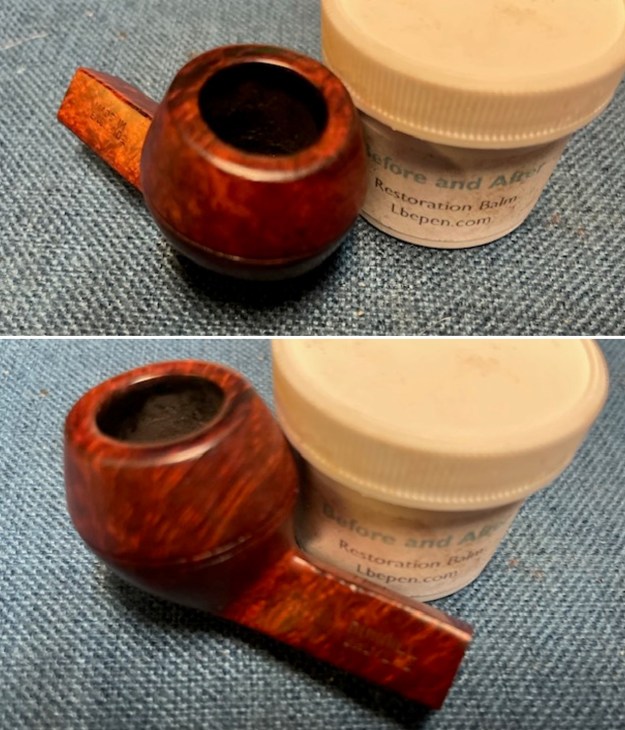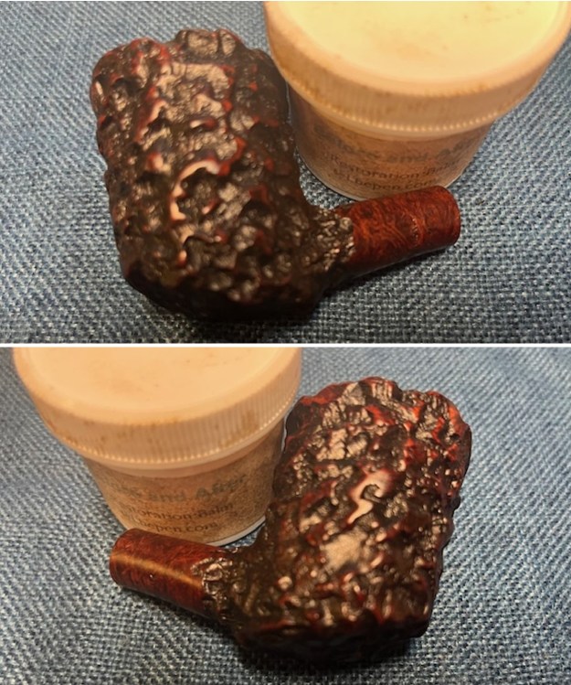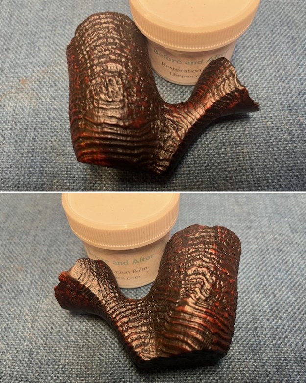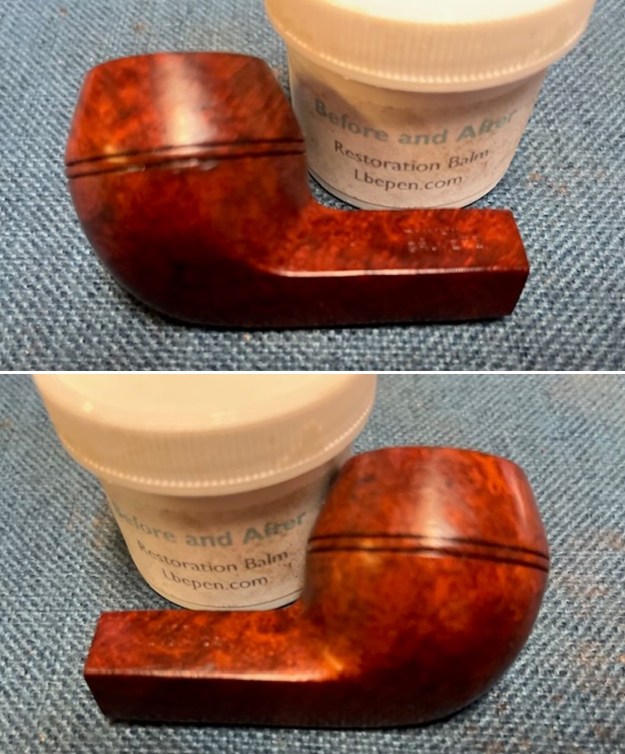 I rubbed the bowl and shank down with Before & After Restoration Balm to deep clean the finish on the bowl and shank. The product works to clean, enliven and protect the briar. I worked it in with my fingers to get it into the briar. I used a horsehair shoe brush to work it into the plateau top. After it sat for a little while I wiped it off and buffed it with a soft cloth. The briar really began to have a rich shine. I took some photos of the bowl at this point to mark the progress in the restoration.