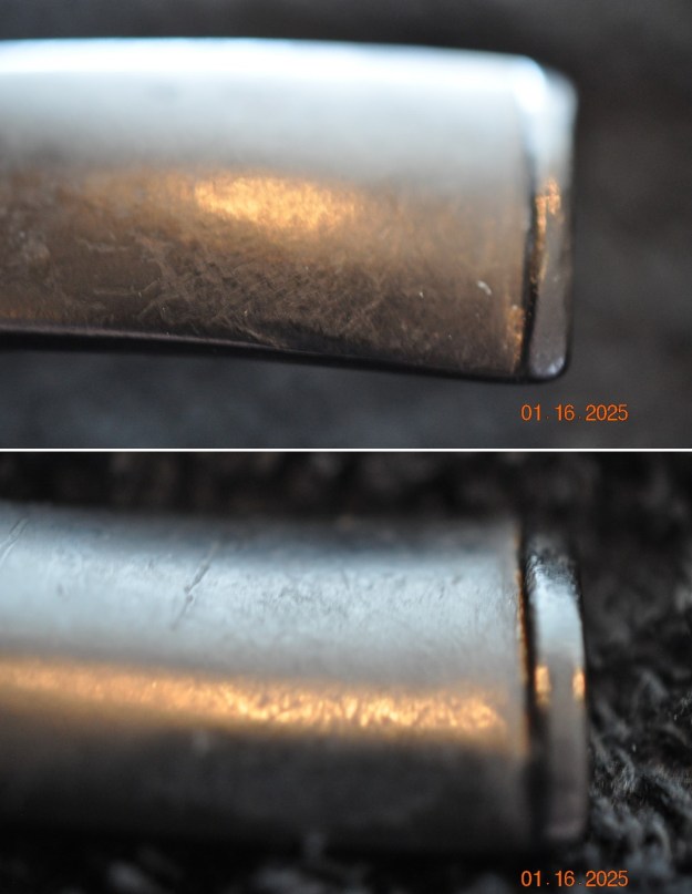 I took photos of the rim top and the stem to show their condition once it arrived in Canada. Jeff was able to clean up the incredibly thick cake and lava overflow that was shown in the rim and bowl photos above. He was also able to get rid of the grime and grit in the surface of the briar. The inner edge of the bowl was in very good condition and was smooth to the touch. The rim top and edges looked very good. The stem looked very good and was much cleaner. There were light tooth marks and chatter on both sides near the button.