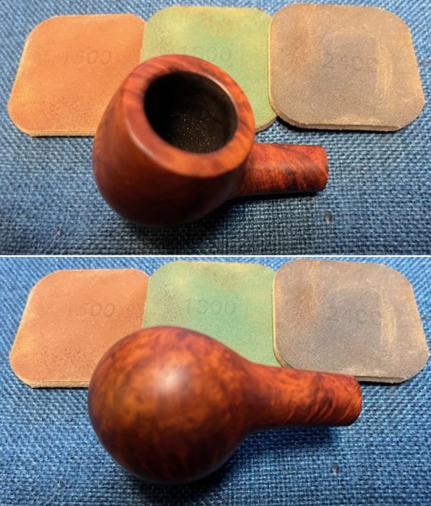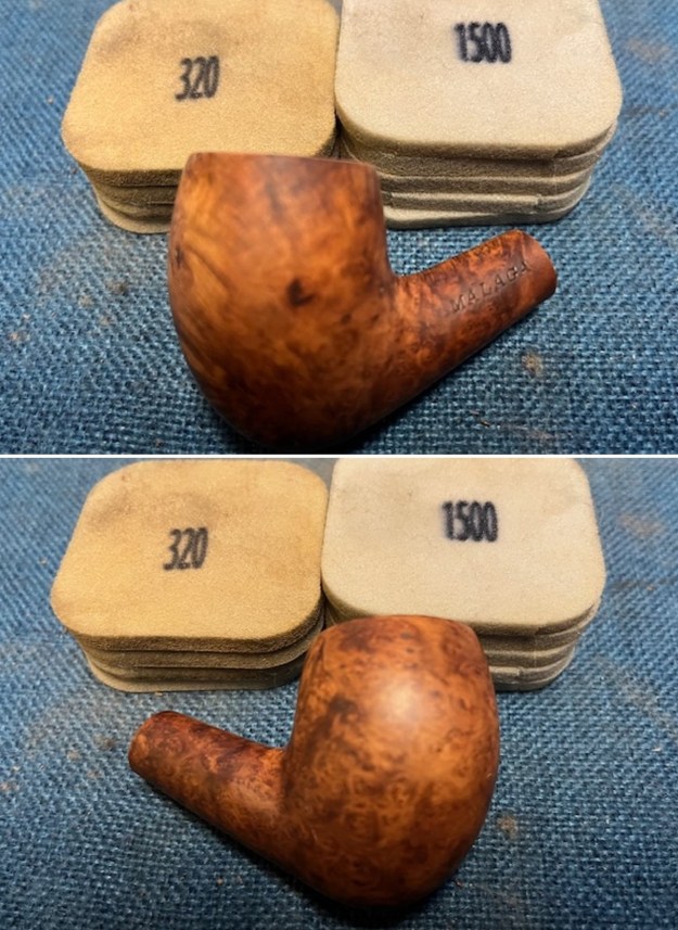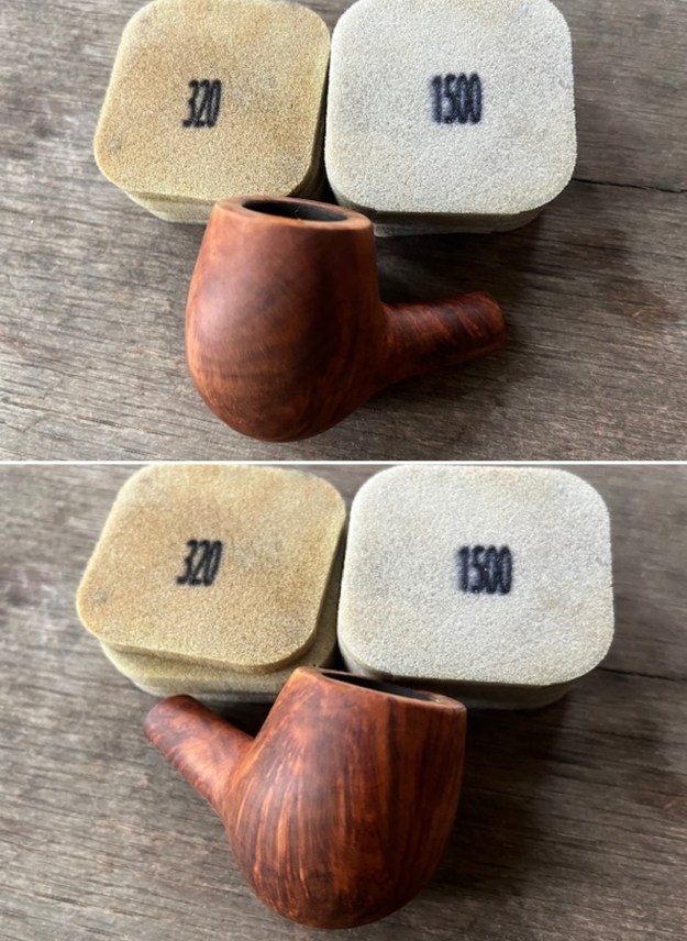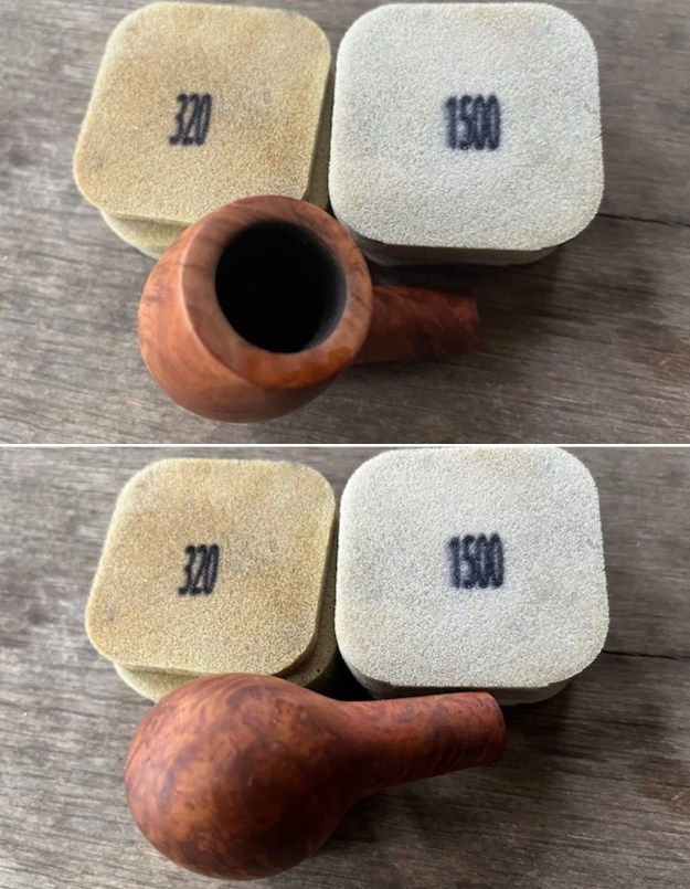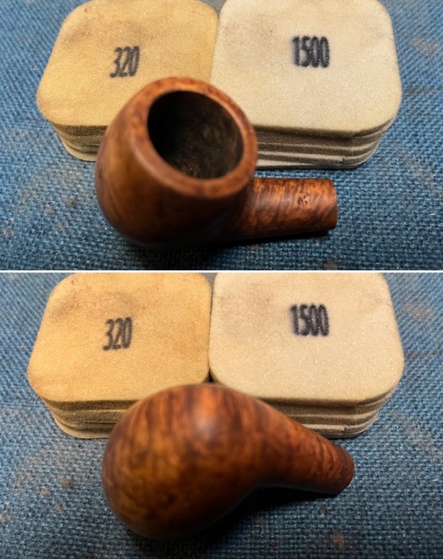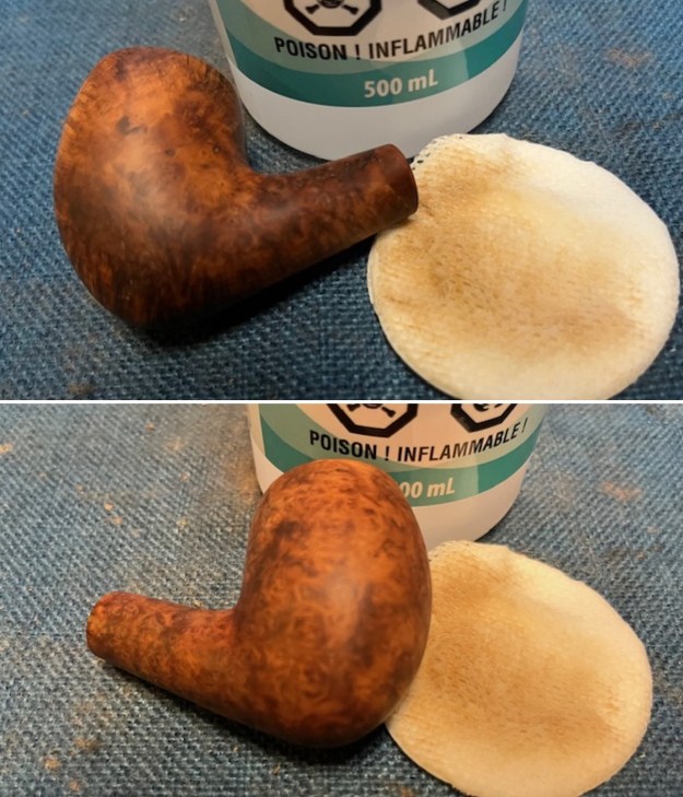 I wiped the bowl down to remove the sanding dust with isopropyl alcohol and cotton pads. Once the repairs looked significantly better than the flaws in the briar that existed before.