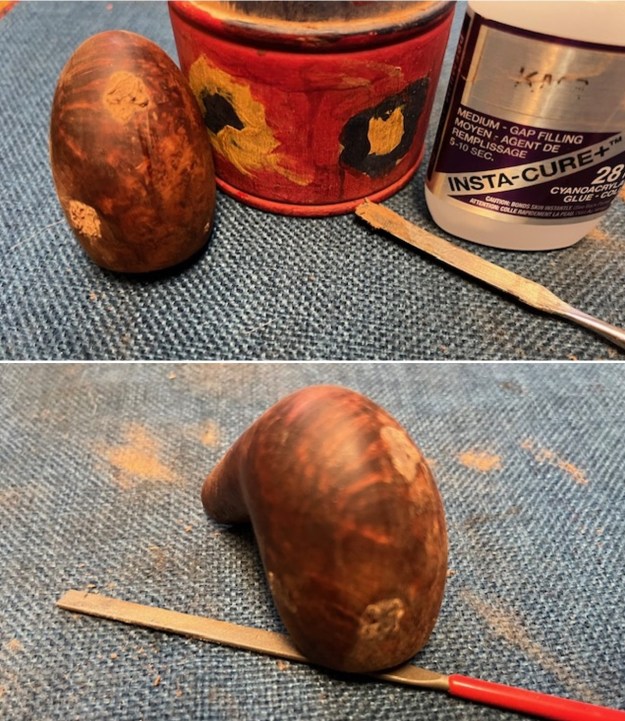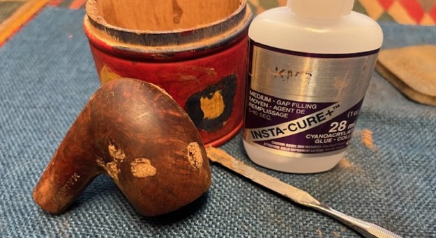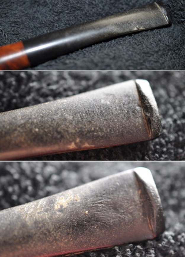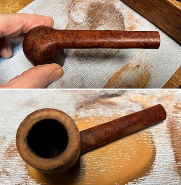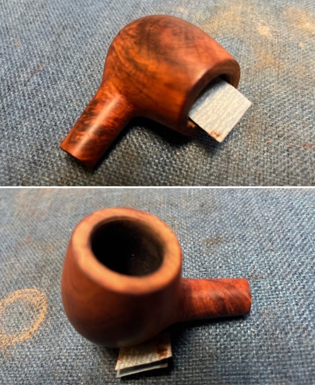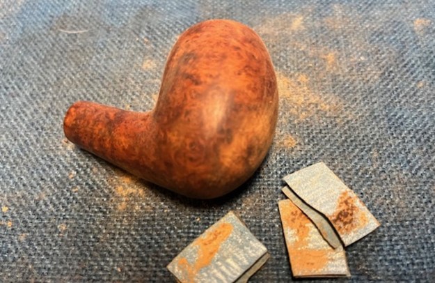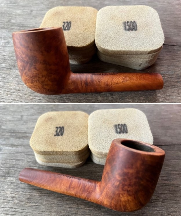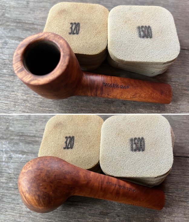 I wiped the bowl down to remove the sanding dust with isopropyl alcohol and cotton pads. Once the repairs looked significantly better than the flaws in the briar that existed before.