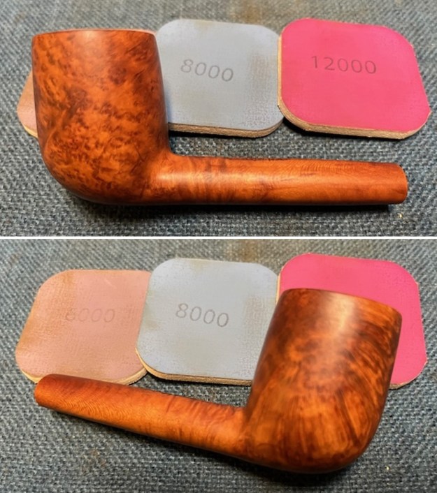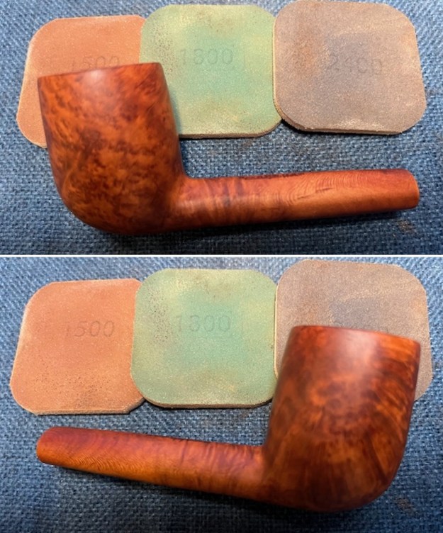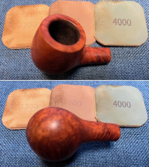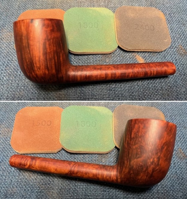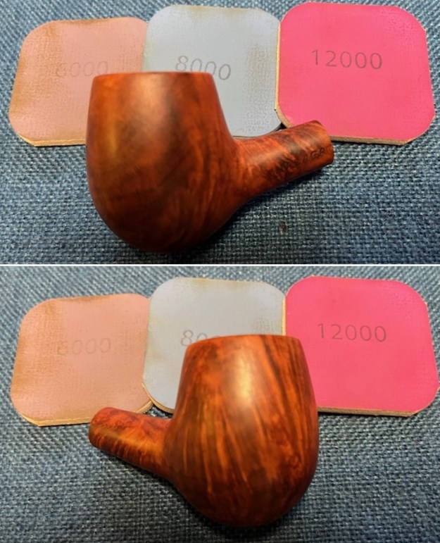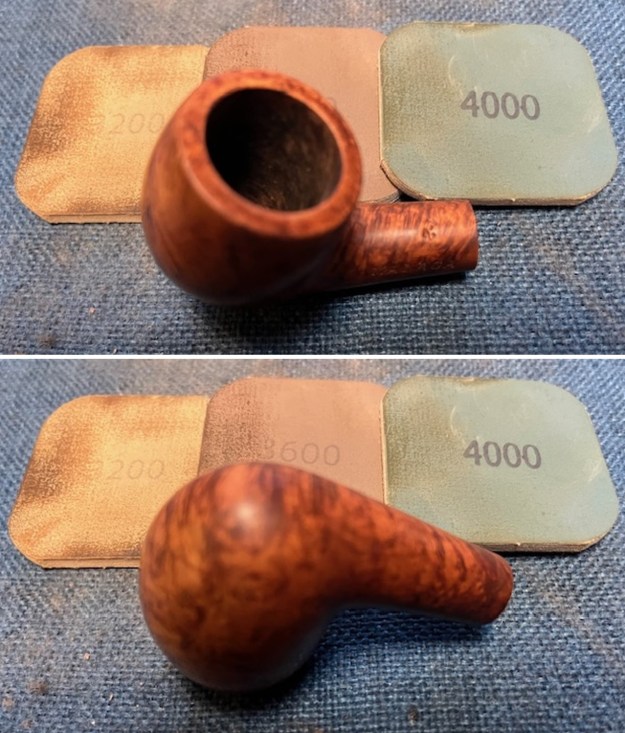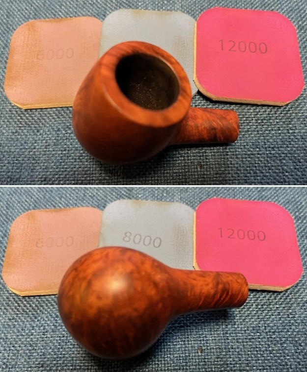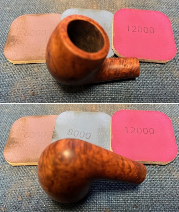 I polished the rim top and the briar with micromesh sanding pads. I dry sanded the bowl with 1500-12000 grit sanding pads. I wiped the bowl down after each pad with a damp cloth to remove the sanding dust.