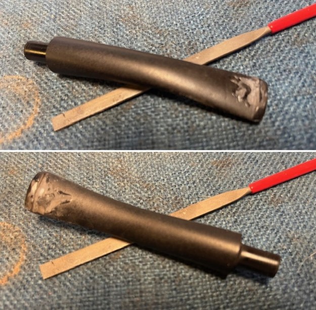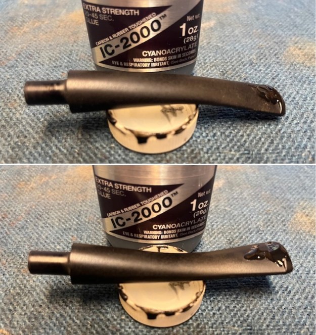 I set the bowl aside and “painted” the stem surface with the flame and was able to lift the tooth marks significantly. I filled in the ones that remained with black extra strength CA glue. I set it aside to cure. Once it cured I flattened the repair with a small file and then sanded it smooth with 220 grit sandpaper. It began to look much better.