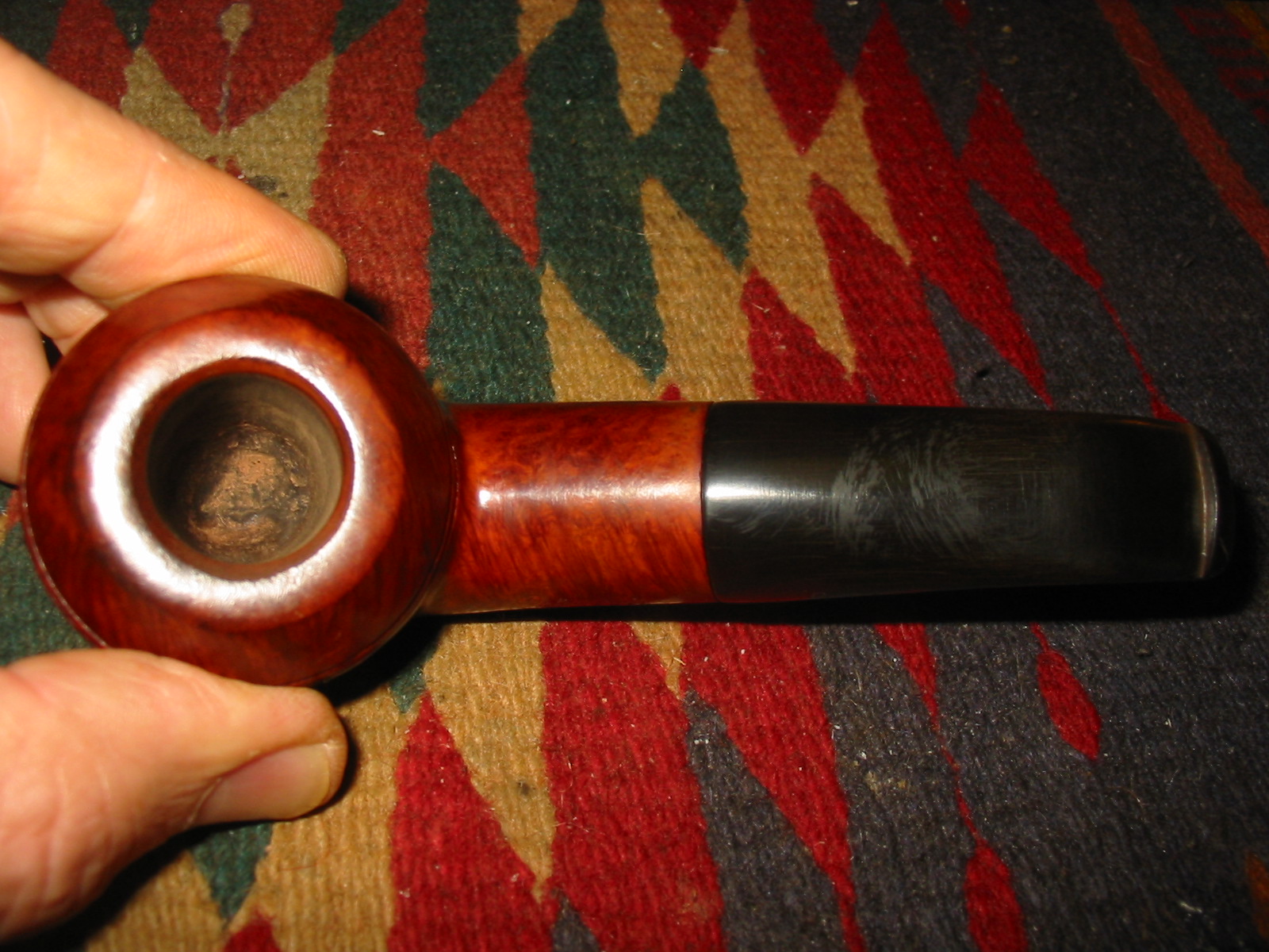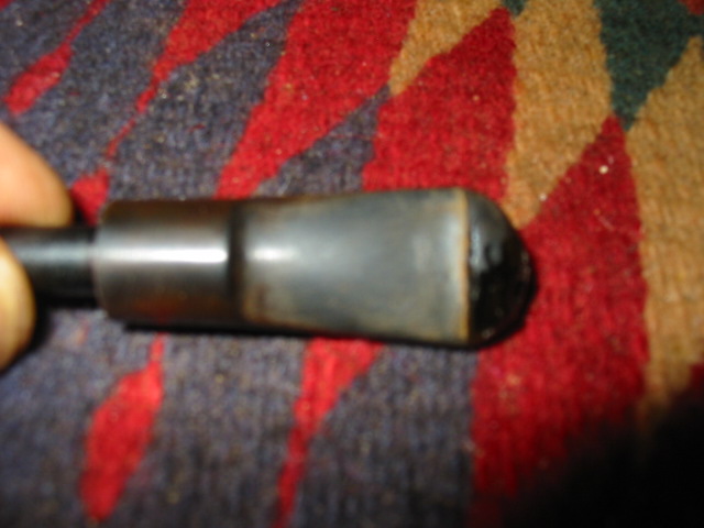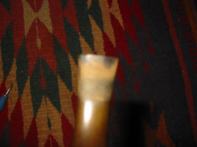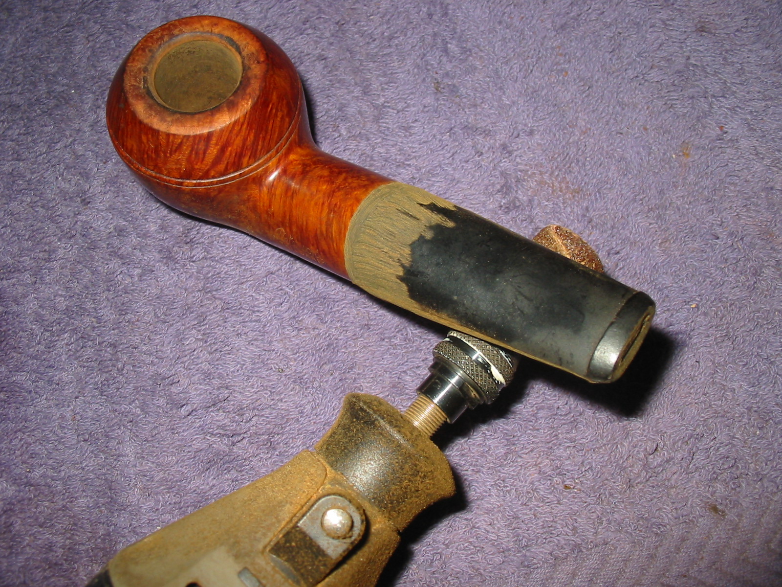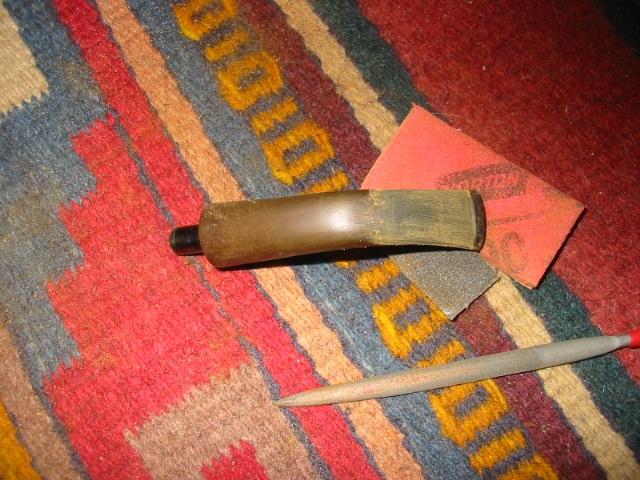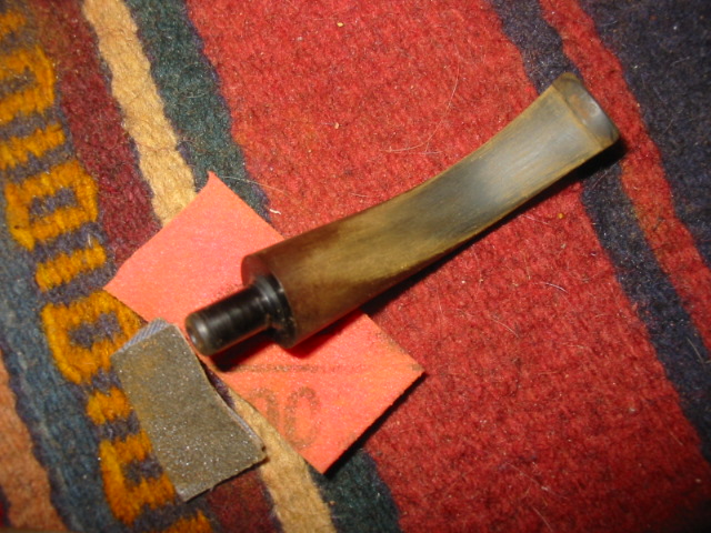 This P-lip drove me to the brink of insanity! Not having a P-lip on hand to compare it to made it more difficult. Filling the bottom hole (that wasn’t supposed to be there) was easy but shaping that top and bottom lip/ridge was a chore. The deep divot just did not want to be filled; the patch shrunk over and over. The huge, dented draft hole on the top of the stem was a bother, too; I can’t tell you how many times I glued it shut trying to get that button rebuilt! In the end it came out pretty good; there are some tiny scratches visible if you look real close. But all things given, the owner was happy with that, especially since with the holidays and even more babysitting duties for me on the horizon, who knows when I would be able to finish it (again).