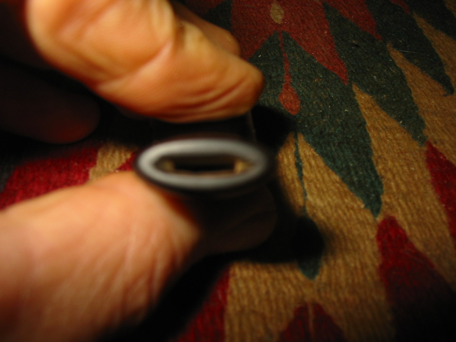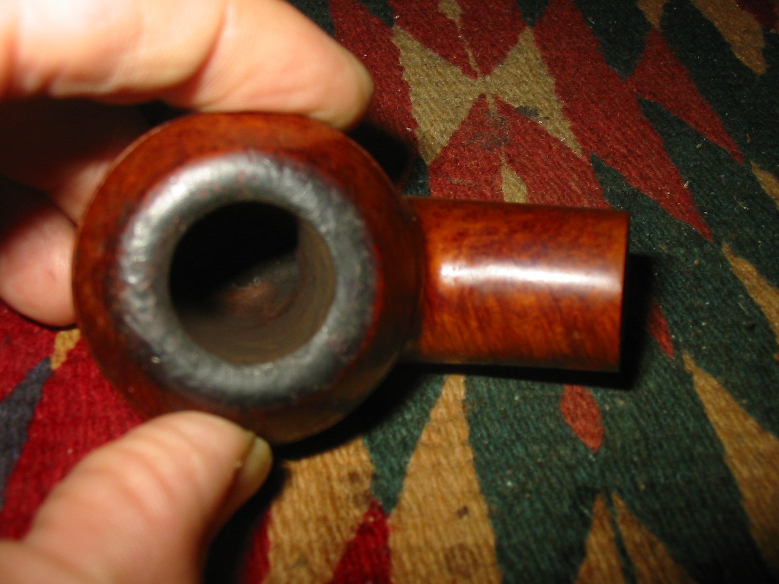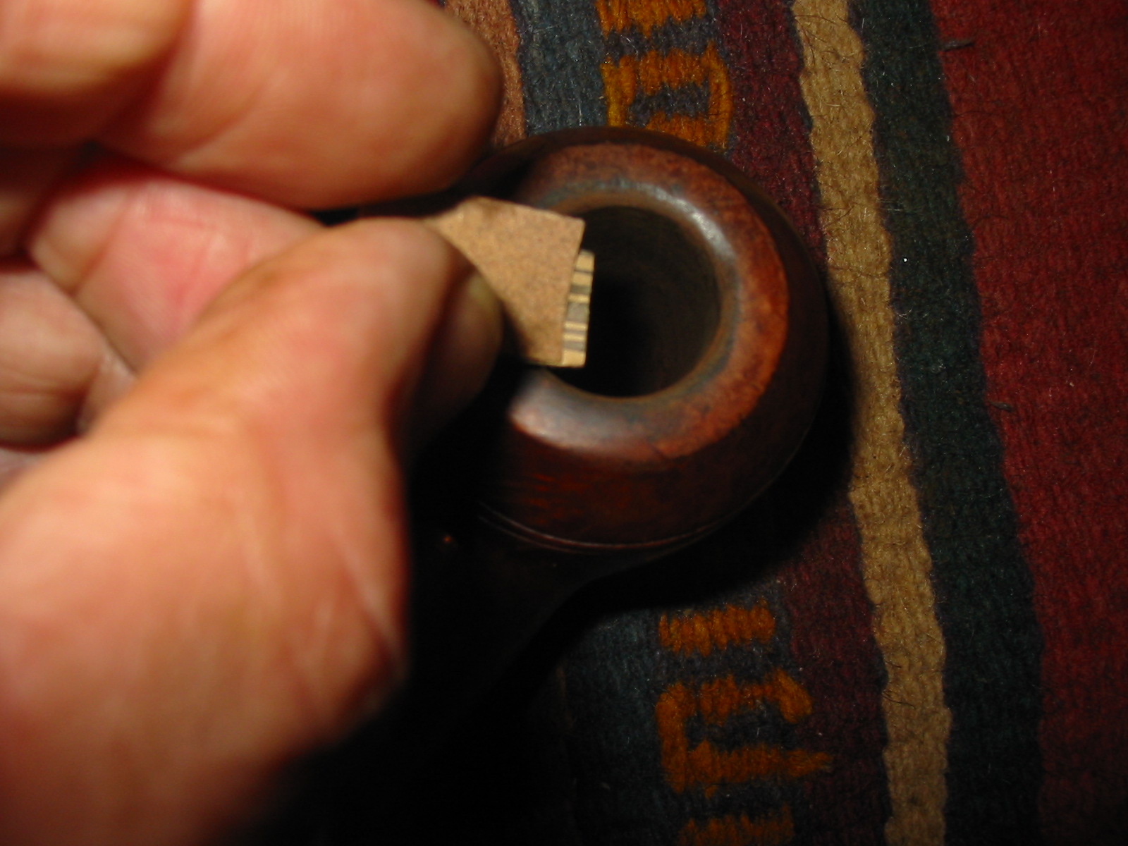 This P-lip drove me to the brink of insanity! Not having a P-lip on hand to compare it to made it more difficult. Filling the bottom hole (that wasn’t supposed to be there) was easy but shaping that top and bottom lip/ridge was a chore. The deep divot just did not want to be filled; the patch shrunk over and over. The huge, dented draft hole on the top of the stem was a bother, too; I can’t tell you how many times I glued it shut trying to get that button rebuilt! In the end it came out pretty good; there are some tiny scratches visible if you look real close. But all things given, the owner was happy with that, especially since with the holidays and even more babysitting duties for me on the horizon, who knows when I would be able to finish it (again).