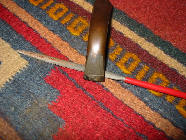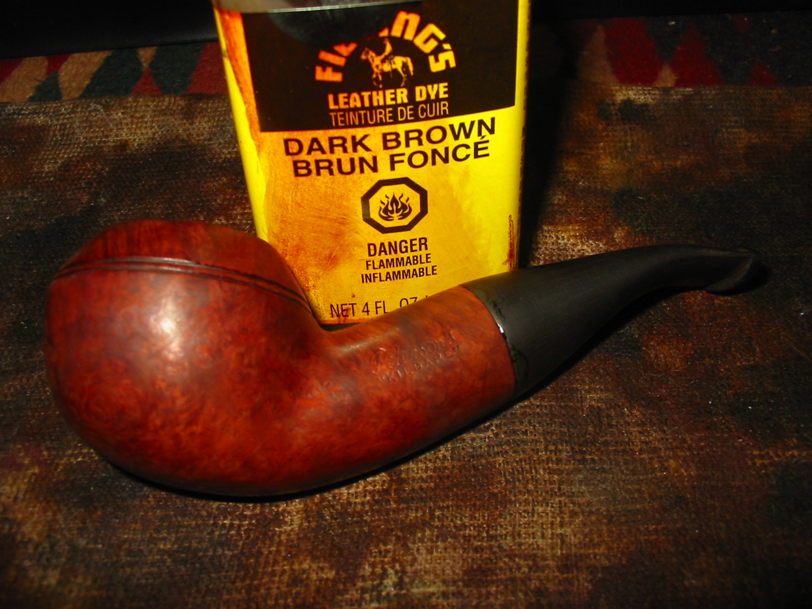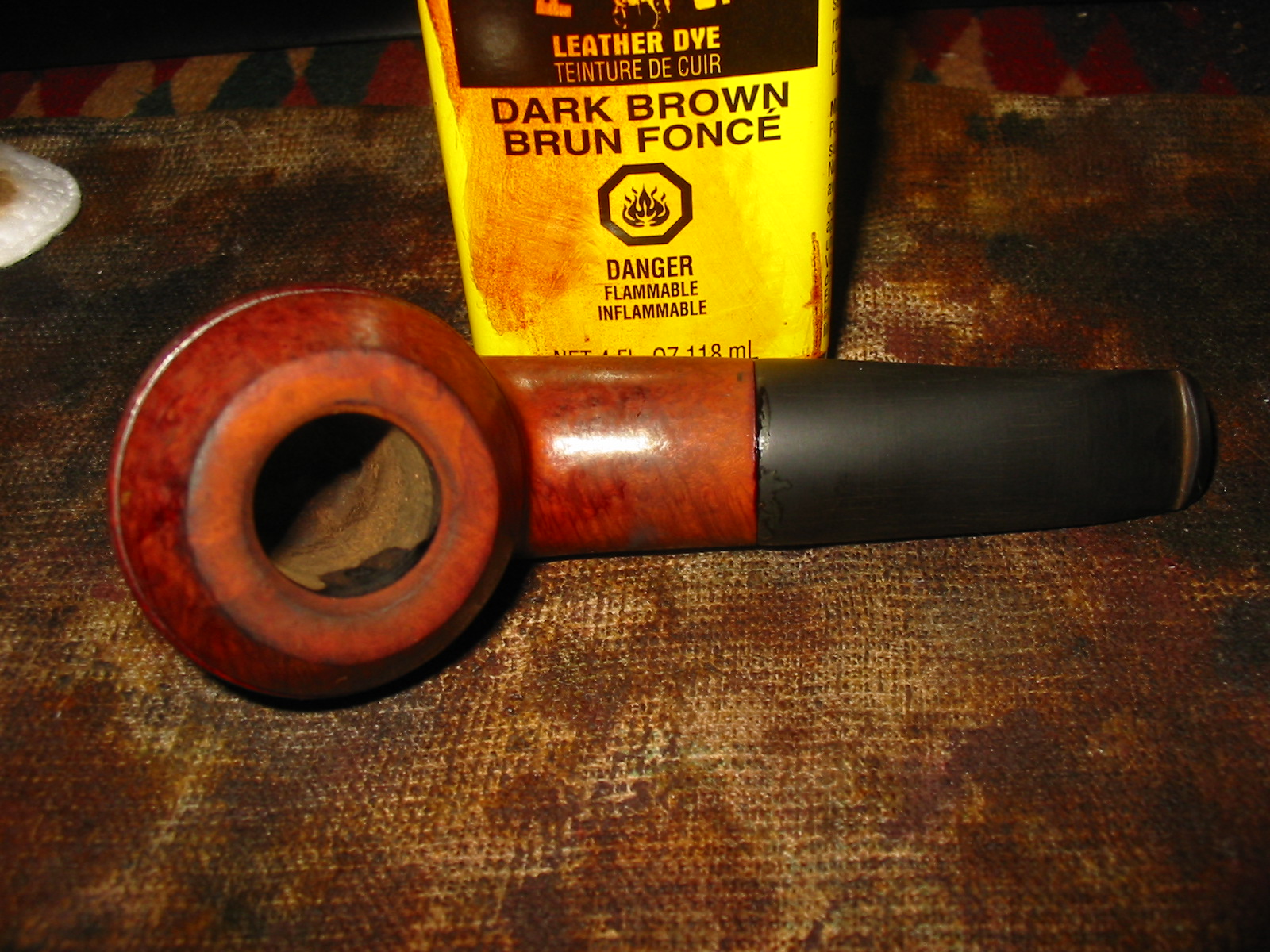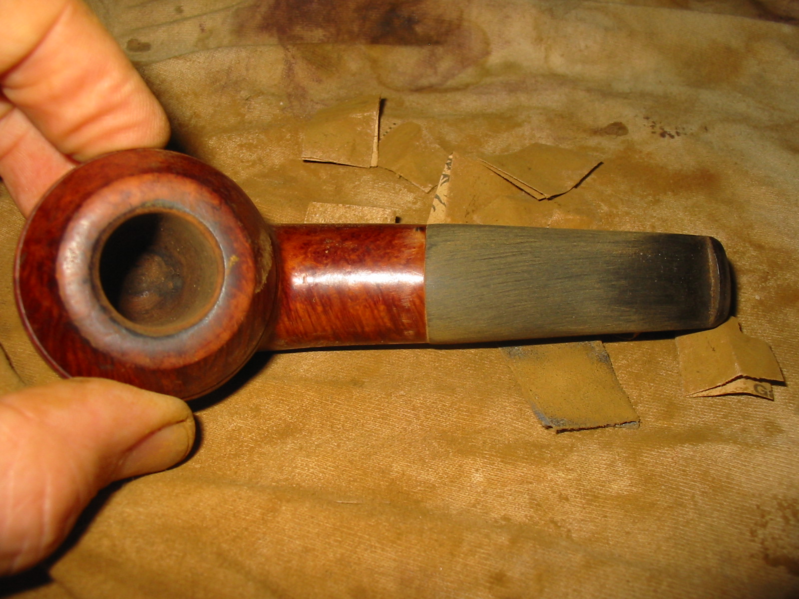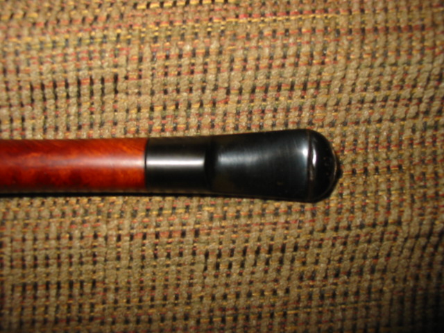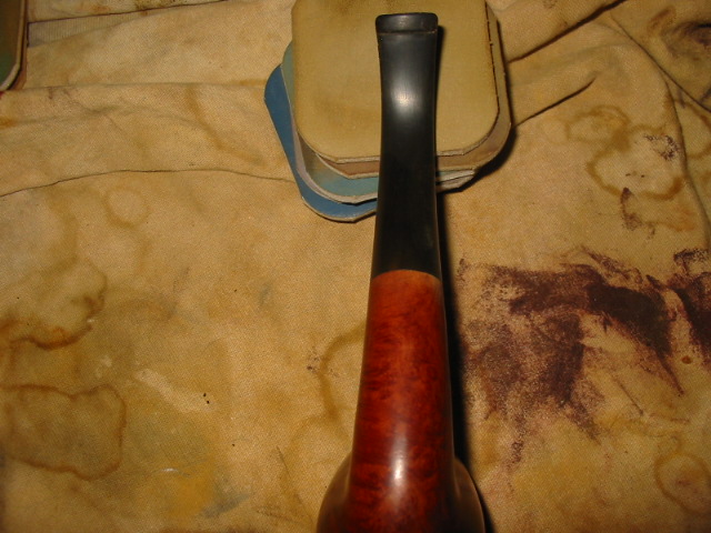During the interim times I worked on the fill that was partly gone and one other dent that stream wouldn’t raise. I used coarse briar dust from filing not sanding (which I think takes dye better and is less apt to just be a black spot) and CA glue to fill the two spots (the worst one is visible in the very first photo in this post). I accidentally over did the fill, costing myself a lot of extra time. However the patch ended up blending in great in the end. After a lot of working the patch to blend I stained the pipe with a diluted Brown Fiebing’s leather dye, two coats, flamed on, if I remember right. After buffing with brown-Tripoli the stummel looked nice but too dark to see the really nice grain (birds eye and flame) so I wiped it down with alcohol on a cotton pad until it let the gain show through and re-buffed with brown-Tripoli. Now the stummel looked good to me. Back to the stem…