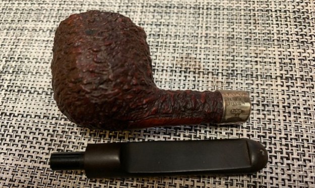The next pipe on the work table is a sandblast Peterson’s Rusitcated Billiard shaped pipe that we purchased from our contact in Copenhagen, Denmark on 11/21/2023. It was stamped on the underside of the bowl and shank and on the heel, it was stamped Peterson’s [over] “Donegal” Rocky [over] the shape number 15. Following that it read, Made in the Republic of Ireland (in three lines). There is a band on the shank that is stamped on the left side and reads K&P in shields [over] Sterling Silver. Under those stamps there are three hallmarks – Hibernia seated, Crowned Harp for country of manufacture and a date letter in this case that was not readable. It has a rusticated finish around the bowl and shank that has a lot of oils, debris and grime in the finish. The pipe had been recently reamed and there was a light cake in the bowl and a lava overflow in the rustication on the rim top. The inner edge of the bowl looks to be in good condition. There was a very beautiful pipe underneath all of the buildup of years of use. The stem was a Peterson’s style P-Lip Taper Stem. It had light chatter on both sides ahead of the button. Jeff took photos of the pipe before he started his cleanup work on it.