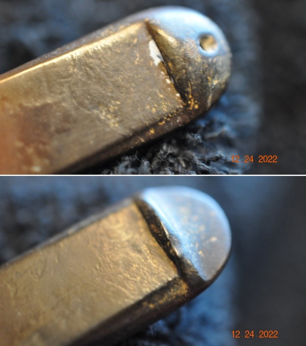 I touch up the P stamp on the left side of the saddle stem with some white acrylic fingernail polish. I pressed it into the stamp with a toothpick and scraped off the excess with the pick and then lightly sanded it with a worn 1200 grit sanding pad.