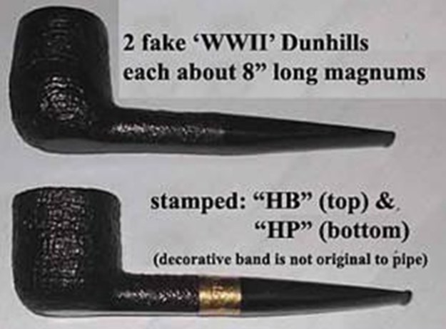 It is important to remember about the 1980s fake Dunhills that of the 50-75 total pipes involved in the overall debacle on both sides of the Pond in which, by Loring’s estimation, perhaps hundreds of thousands of dollars were paid for technically bogus pipes, “in almost all cases,” they were excellent in terms of craftsmanship and were “akin to top quality 1980s English Dunhill alternatives such as Ashton or Upshall.” The photo below from Loring’s collection shows two supposed World War II-era pipes, both magnums about eight inches long and each a beautiful Dunhill pipe – if only each had been manufactured in the Dunhill factory and not stamped with outrageous nomenclature. The shape codes HB and HP have come to be known as existing only on fakes.