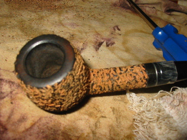 The finish on the outside of the pipe is rusticated in a finish that is quite different from the other two rusticated pipes I have purchased from Bill. It is not a heavy deep rustication on this pipe but more of a rustication pattern that has the appearance of strands of a rope. There is a still a very tactile feel to the rustication on the bowl and shank but it does not really have the look of randomness that was in his more heavy rustication. It is a nice variation and I think that it adds to the overall appearance.