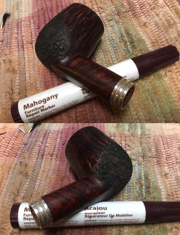 Now it was time to look at it up close and personal. Jeff had done an amazing job in removing all debris and bits of broken briar from the finish. He had done a quick reaming of the bowl with a Savinelli Fitsall Pipe Knife. He scrubbed the exterior of the bowl with Murphy’s Oil Soap and a tooth brush to remove the grime the grime and dirt on the finish so the pipe was clean – damaged but clean. He cleaned out the interior of the bowl and shank with pipe cleaners, cotton swabs and alcohol until they came out clean. The rim top looked quite daunting with the missing chunks of briar but it too was clean. He cleaned the stem with Soft Scrub to remove the grime on the exterior and cleaned out the airway with alcohol, cotton swabs and pipe cleaners. I took some photos of the pipe as I saw it when I brought it to the work table. To show how the rim top and stem looked at this point I took a close-up photo of the rim and stem. The bowl was clean and the damage to the inner edge and the rim top was very visible. It was a mess! The black acrylic stem was saved from major dog chomping. There are just a few tooth marks on both sides of the stem that could be addressed fairly easily.I removed the stem from the bowl and took photos of the parts. I chose the left side of the bowl as really both sides were equally damaged. This is truly a sad sight to see as the great grain on the bowl shows up nicely under the damage.I had been thinking about what to do with the finish since first seeing the photos. I had decided I would rusticate it but was undecided as to what extent I would go in the process. I wanted to retain the original shape and intent of the pipe while working out the damages. I started by using three different burrs on the Dremel – a ball, a cone and cylinder. Each one gives a slightly different finish. I worked them one after another to seek to blend in the tooth marks as much as possible. I also decided to rusticate the worst areas – the base and part way up each side of the bowl and the entire bowl front. The photos show this first step. I decided to let that rustication pattern sit with me for awhile and not add more to it. I just wanted to think about it for a  while. I decided then to patch the bite marks in the upper part of each side and the entire back of the bowl. I also wanted to repair as much of the rim top and edge damage as I could. I used clear super glue and briar dust to patch the many tooth marks around the bowl. The photos show the freckled sides. I built up the damaged front outer edge and the deep marks on the top of the rim with super glue and briar dust. These took some layering to do the job. I looked over the rustication some more and was not completely satisfied with the coverage of the existing rustication or the distance I came around the sides of the bowl. I decided to use a tool that a reader of rebornpipes made for me for rusticating. You can see it in the photos. It is essential a group nails bound together in a handle and with a clamp to give me multiple points to rusticate with. The way it works is to press it into the briar and twist it. You move across the briar until it is “randomly” covered. Once I was happy with the coverage I knock off the debris left behind with a brass bristly brush. I like to knock it down and smooth it out to give it an old leather like look to the rustication. I left the rustication and turned to address the damage to the rim top. I topped the rim with 220 grit sandpaper on the topping board. Once it was smoother and flatter I filled in the divots and holes in the rim top and edges with briar dust and super glue once more. Once I finished I topped it once more to smooth out the repaired areas.With that finished for the moment I turned to sanding the smooth portions of the bowl. I used my Dremel and sanding drum to flatten out the repaired areas first. I followed up by sanding them with 220 grit sandpaper. The photos below show the bowl at this point in the process. Note that there was no damage to the shank so I left it as is and would match the stain to that once I stained the repaired area. I was pretty happy with the way it was looking. I was ready to stain the undercoat on the bowl. I decided to use a black aniline stain for the rusticated part of the bowl and for the undercoat on the smooth sides and rim top. Black does a great job hiding the kind of repairs that I had to do with this briar. I applied the stain and flamed with a lighter. I repeated the process to ensure the coverage was thorough. I flamed it again and set it aside to dry while I had some dinner.I took photos of the bowl at this point to show the coverage of the black stain on the rustication and the undercoat on the smooth areas. After dinner I wiped down the smooth areas with isopropyl alcohol on a cotton pad to make them more transparent and show the grain. I then gave the smooth areas a coat of Mahogany stain using my stain pens to get into the transition areas and control the flow better. The combination of the black undercoat and the Mahogany matched the original shank colour! When that coat of stain had cured I polished the smooth portions of the bowl with micromesh sanding pads. One of the pains of this process is all the flaws show up in the initial sanding. You can see my repairs in some spots but hopefully they bill disappear a bit in the polishing. I was really happy with the right side of the bowl. The repairs virtually disappeared in the staining and sanding. I worked on the left side a little more. I sanded the offending areas of the transition with 400 grit wet dry sandpaper and restained the area. I worked through all of the micromesh pads another time on that area. I was happy with the finished looked at this point. I rubbed the finish down with Before & After Restoration Balm. I worked it into the smooth areas on the bowl and rim top with my fingertips and the rusticated areas with a horsehair shoe brush. The product cleans, pro