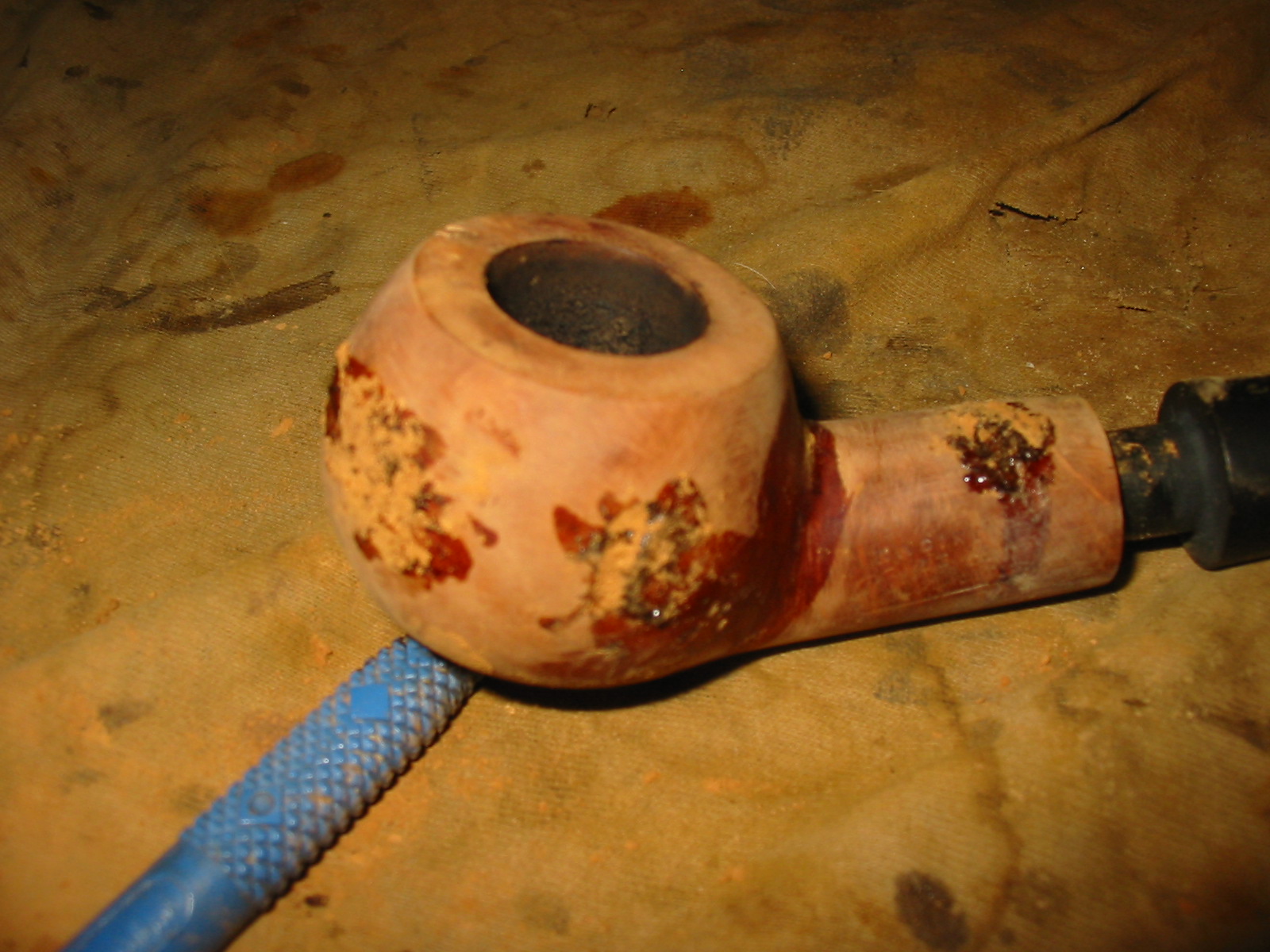 I started by removing the silver band, which came off without any effort and used Heirloom Stripper to remove all the dirt, grime, old finish and lift some of the stain. This allowed me to get a real good look at the damage to this pipe.