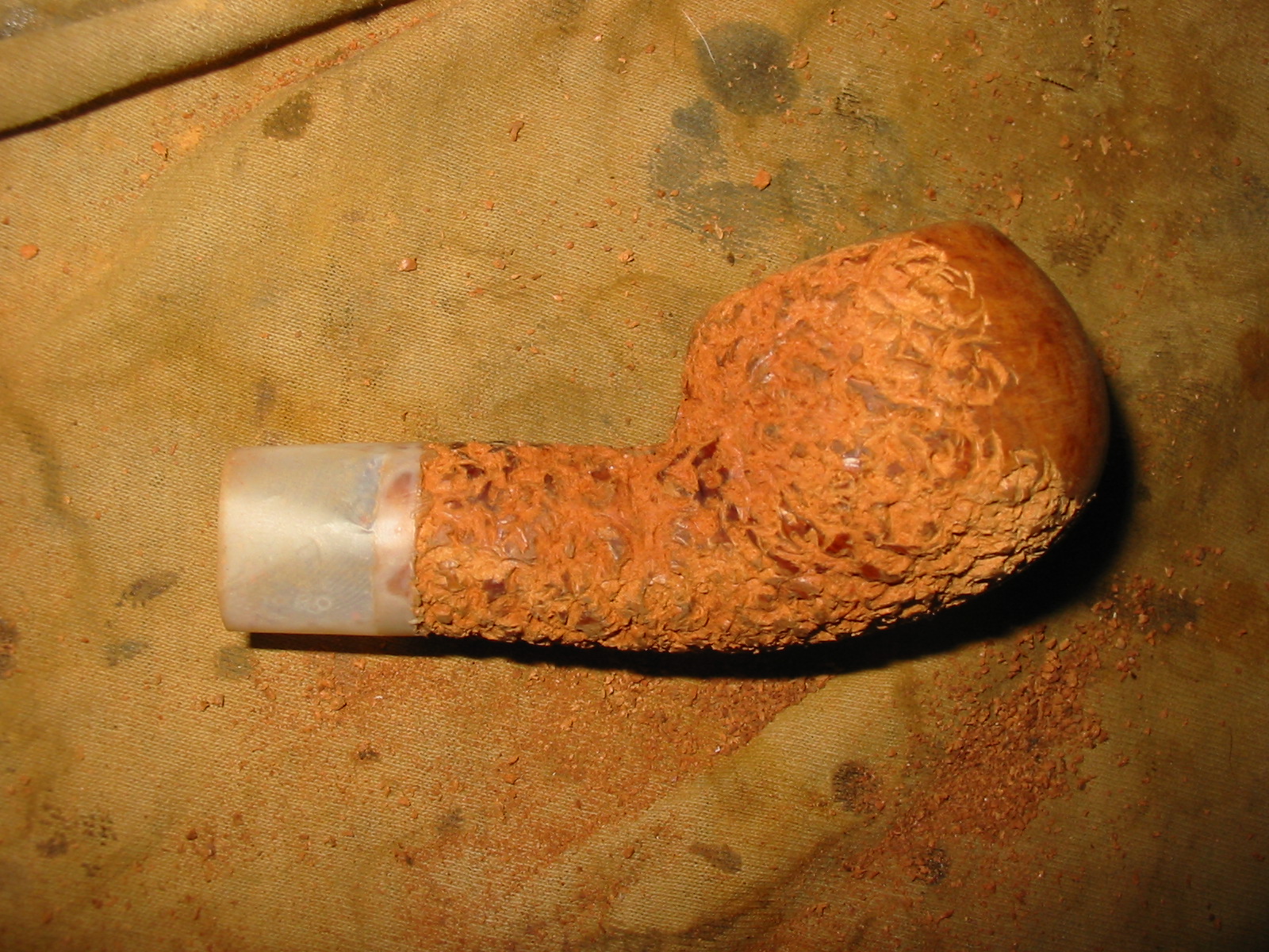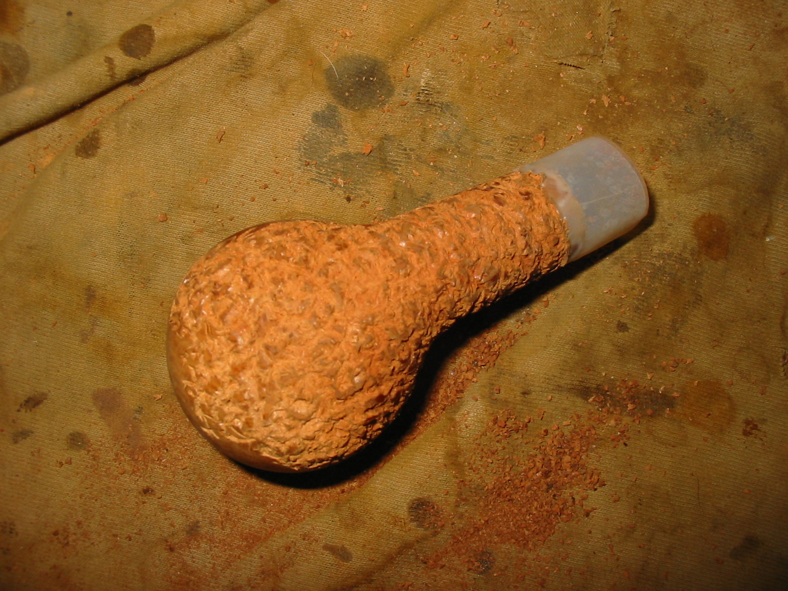 I decided that I would rusticate this pipe and leave a smooth patch somewhere, where I hadn’t determined yet. Using a Dremel and a 107 Carving bit I started to rusticate the shank and worked my way to the heel, then up the stummel. Halfway up the stummel the pipe revealed its final design-leave the top of the bowl smooth! I wasn’t sure at first because it would mean I had to blend in that CA patch, but I now avoided trying to rusticate it.