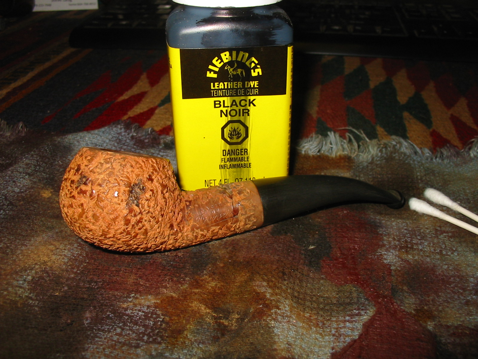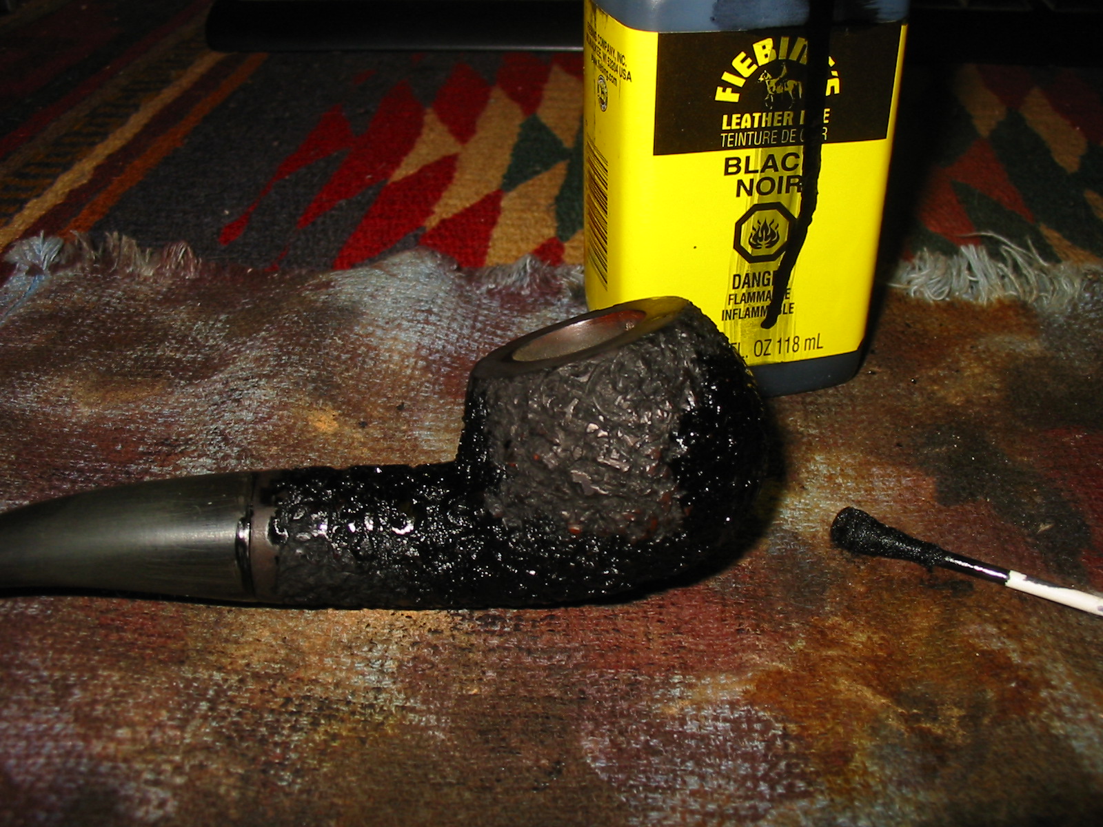 I used Fiebings Dark Brown alcohol based dye over the entire pipe as a base, then wiped on Fiebings Oxblood till I achieved the colour I wanted. To seal the stain in the pipe I applied a thin layer of shellac which gave it a glossy look I didn’t like. I left it, and just stayed the course with this experiment to see how it turned out.