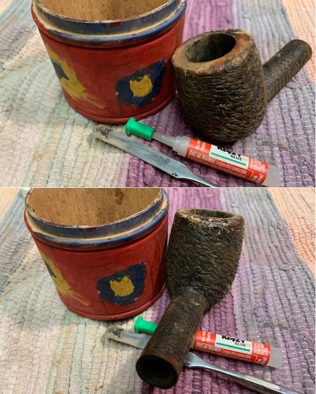 I decided to take care of the damage on the rim top and inner edge first. I topped the bowl to give it a smooth surface. I built up the damaged areas on the outer edge with super glue and briar dust to take care of the damage.