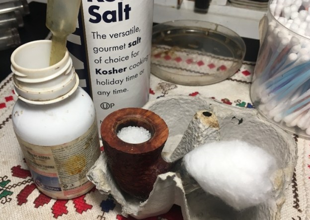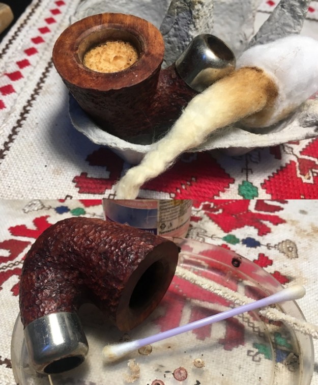 I decided to de-ghost the bowl to be on the safe side. I thrust some cotton balls into the bowl and the shank and saturated them with 99% isopropyl alcohol. I let the stummel sit overnight. This caused any remaining oils, tars and smells to leach out into the cotton.