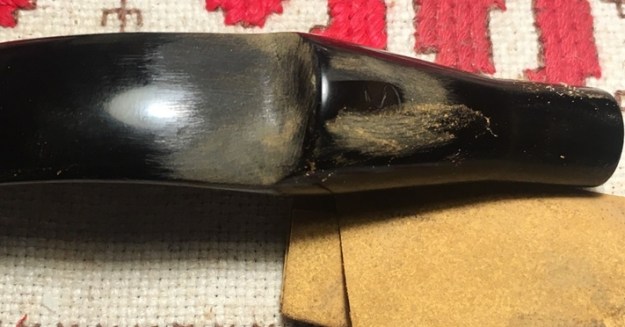 At this point, it was clear that more than the ‘usual’ sanding was going to be required here. I took two sanding sponges (220- and 320-grit) and worked the stem hard. I needed to sand out the remaining oxidation to get this stem the best chance of looking decent again. I then used all nine Micromesh pads (1,500 through 12,000 grit) to bring out the lovely black lustre. I also used Obsidian Pipe Stem Oil in between each pad scrubbing. As I mentioned before, there are still hints of its past life, but I’m pretty pleased with how the stem came out.