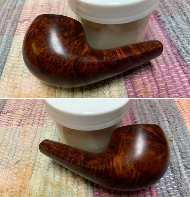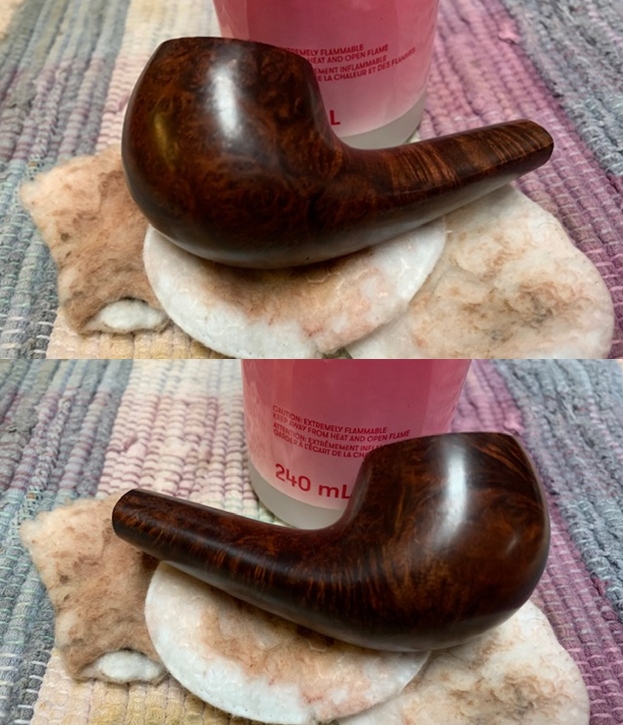 This nicely grained Savinelli Lollo Pocket Pipe with its short snub nosed vulcanite stem is a great looking pipe now that it has been restored. The briar is clean and really came alive. The rich walnut coloured stain gave the grain a sense of depth with the polishing and waxing. The grain really popped. I put the vulcanite stem back on the bowl and carefully buffed the pipe with Blue Diamond on the buffing wheel using a light touch on the briar. I gave the bowl and the stem multiple coats of carnauba wax on the buffing wheel. I buffed the pipe with a clean buffing pad to raise the shine. I hand buffed the pipe with a microfiber cloth to deepen the shine. The finished Lollo Pocket Pipe is a beauty and feels great in the hand and looks very good. Give the finished pipe a look in the photos below. The dimensions of the pipe are Length: 4 inches, Height: 1 ½ inches, Outside diameter of the bowl: 1 ¼ inches, Chamber diameter: ¾ of an inch. The weight of the pipe is 38grams/1.34oz.Thanks for reading this blog and my reflections on the pipe while I worked on it. There are many more to come!