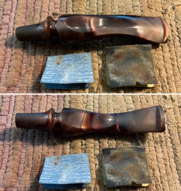 At this point, I took a BIC lighter and ‘painted’ the stem with its flame in order to lift the tooth marks. This was moderately successful in raising the dents. Once that was done, the stem went for an overnight soak in the Before & After Hard Rubber Deoxidizer. After soaking, I cleaned off the de-oxidizing fluid with alcohol, pipe cleaners, et cetera. The oxidation had migrated to the surface and I used SoftScrub to work it off. I was surprised at how poorly this worked (as compared with other restorations), so I actually sent it for another soak in the deox fluid and repeated the same cleaning procedures afterwards.