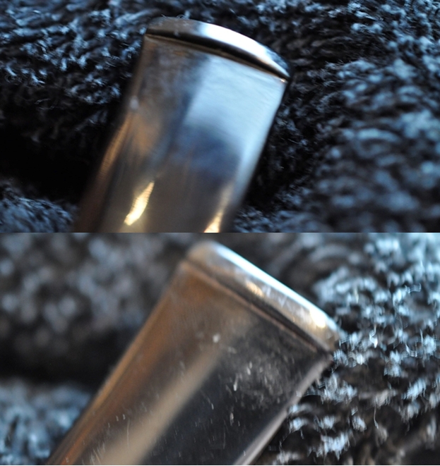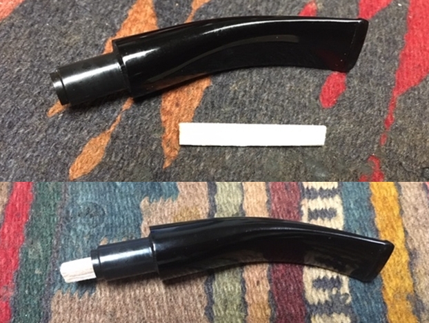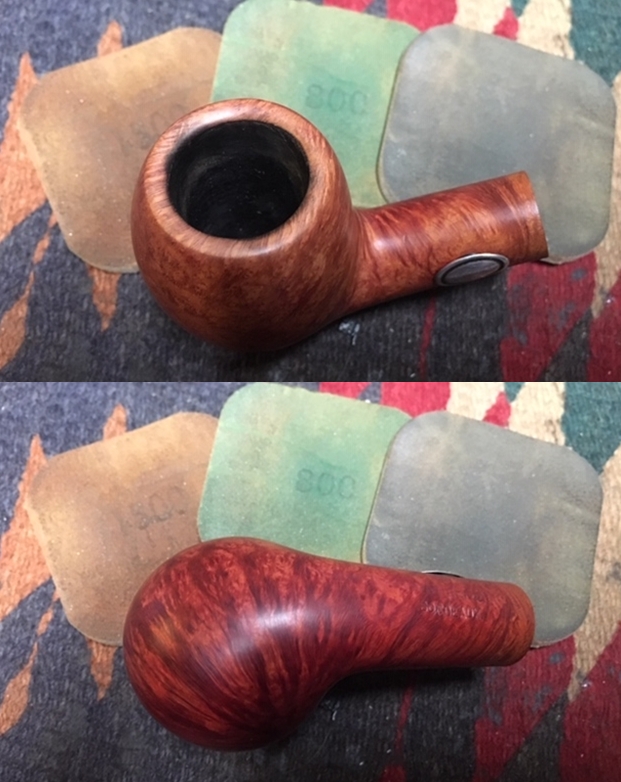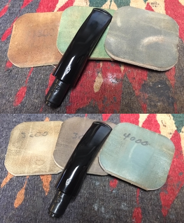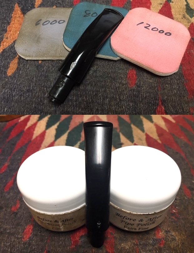 I sanded out the tooth marks and chatter on both sides of the stem with 220 grit sandpaper. I polished the sanding marks with 400 grit wet dry sandpaper. The photos show the stem at this point.