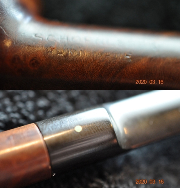 He took photos of the sides of the shank to show the stamping. The stamping is faint but readable in the photos below and is as noted above – on the left side it reads Schoenleber Hand Made. He did not take a photo of the right side but it reads Imported Briar and the number 3 at the shank/bowl junction on the right side. The stem has a light blue dot on the top of the saddle.