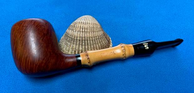 It is a hot day here in Vancouver so I decided to head to the basement where it is cool and work on another pipe. This one was purchased on 11/14/2022 in a lot of pipes that came to us from a seller in Copenhagen, Denmark. It included a group of Stanwell Bamboo pipe that are quite beautiful, combining a briar bowl, a bamboo shank and in this case an acrylic stem. The pipe is a nice looking pot shape. The grain around the bowl and short briar portion of the shank has a mix of cross and birdseye grain. The pipe is stamped on the left side of the bamboo and reads STANWELL vertically between the knuckles. The pipe was a well used pipe when Jeff received it. Someone had given it a coat of varnish so it was quite shiny but there was grime underneath. The mixture of brown stains highlights some beautiful grain under the dirt. The bowl had been reamed and it was clean.  There was some darkening and some nicks on the crowned rim top and one burn mark on the left rear. The inner edge had some darkening and some nicks around the edges. The outer edge on the front of the bowl had been damaged and someone had repaired it somewhere along the journey. It had been sanded smooth and changed the profile of the crowned rim at that point. I would need to rework that area. The stem is acrylic and was dirty with some deep tooth marks on both sides ahead of the button and on the button itself. There is a brass/gold crown S logo inlaid on the left side of the taper stem. I took photos of the pipe before I started the clean up work on it. I took photos of the bowl and rim top to show what they looked like before the clean up. You can see the darkening on the inner edge and top of the rim. It is hard to see but there is damage that is well hidden at this point on the front outer edge of the bowl. I took some of the stem to show the condition of both sides. You can see the deep tooth marks on the top and underside next to the button. They will take some work.The photos of the sides and heel of the bowl show the uniquely stained grain around the bowl and shank. The mixture of black and brown stains adds depth finish on the pipe. Even under the grime it is a real beauty. The two knuckle bamboo shank has a nice patina on it that will only get better with time. It had a black acrylic spacer between the shank and the bamboo and the stem and the bamboo.The stamping on the left side the bamboo is shown in the photo below. It is clear and readable as noted above. It also shows the gold crown S on the stem side. I removed the stem from the shank and took a photo of the pipe to show the flow and cut o the pipe. It is a beauty.I turned to several of the previous blogs that I have written on other Stanwell Bamboos that I have restored. I have included the information from those blogs on the line. I turned to Pipephil to get a quick review of the brand (http://pipephil.eu/logos/en/logo-stanwell.html). The Brass Crowned S inlaid logo on the stem is shown in the photo below. I have included a screen capture of the brand info there.I then turned to Pipedia (https://pipedia.org/wiki/Stanwell) for more information. The article is great and gives a lot of history on the brand. There were also links to catalogues at the bottom of the page. I am including a page from a catalogue on the site below that gives a bit of a glimpse into the brand. Here is the link (http://www.axeljeske.de/Pfeifen/Stanwell_Amager.pdf). The catalogue page gives a great description of the Bamboo line. It reads as follows: Top quality bowls perfectly fitted with porous bamboo shanks for casual elegance.