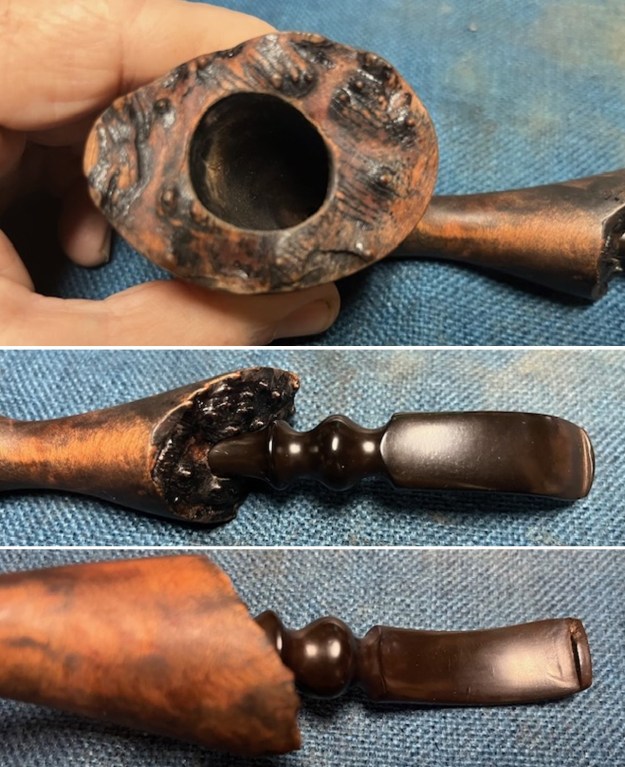 I took photos of the bowl and rim top to show the thickness of the cake and the lava coat on the rim top. There was some tobacco debris in the bottom of the bowl. The stem photos show the condition of the saddle stem ahead of the button.