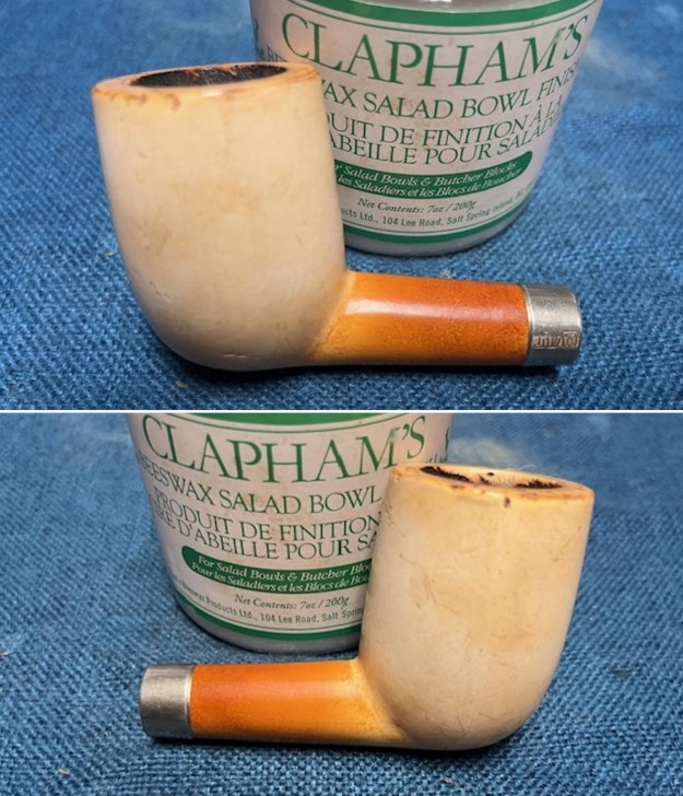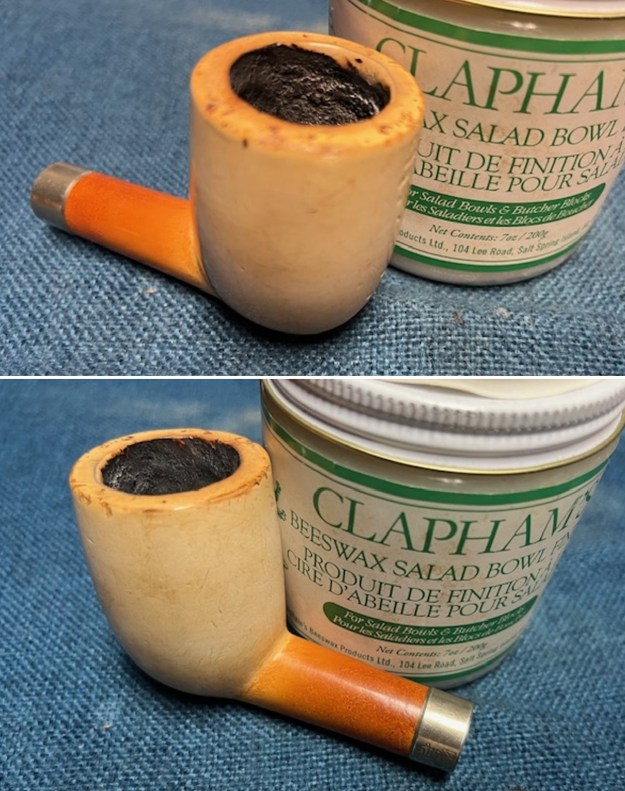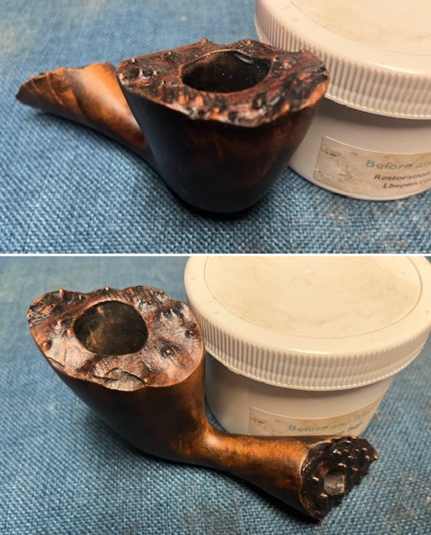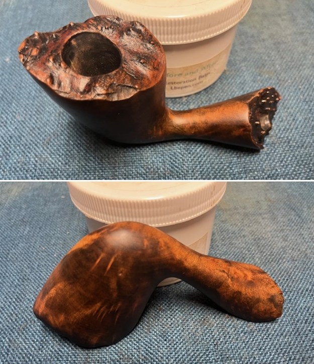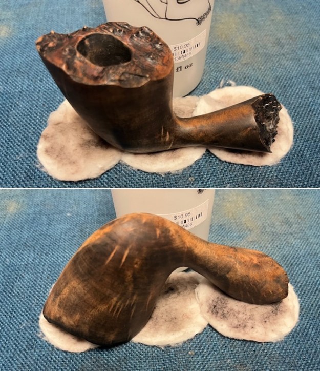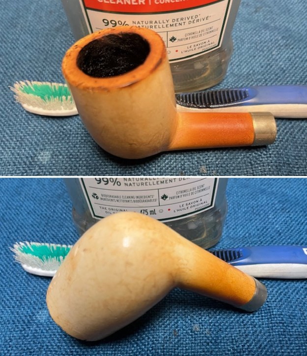 I scrubbed the bowl and shank with a tooth brush and some undiluted Murphy’s Oil Soap. I rinsed it off with warm water to remove the dust and soap from the finish. I dried it off with a soft cloth and it looked much better.