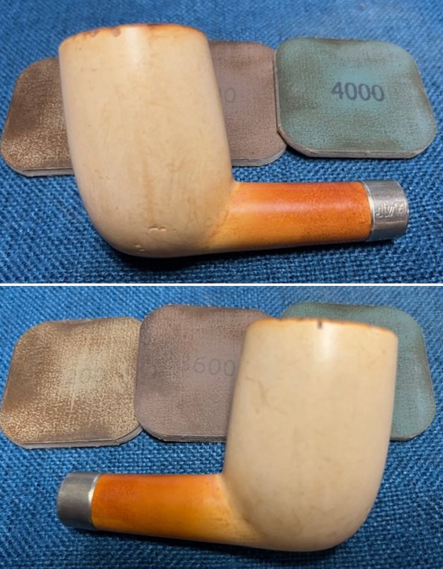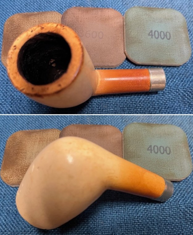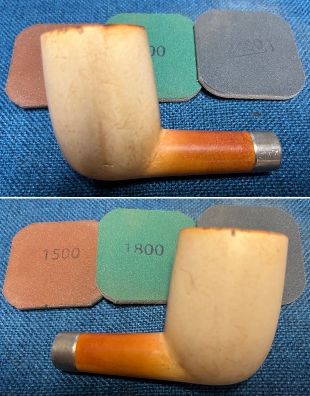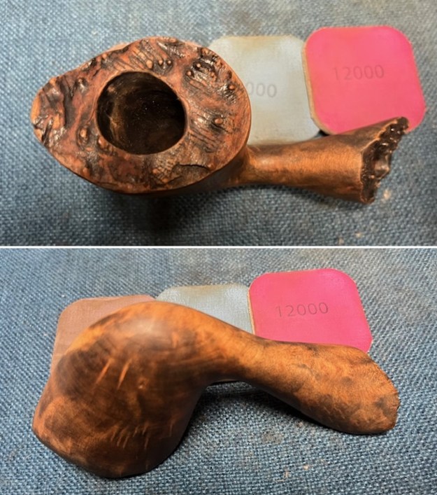 I polished the vulcanite with micromesh sanding pads – 1500-12000 grit pads. I wiped it down with Obsidian Oil after each sanding pad. I used Before & After Pipe Polish – both Fine and Extra Fine to further polish the stem.