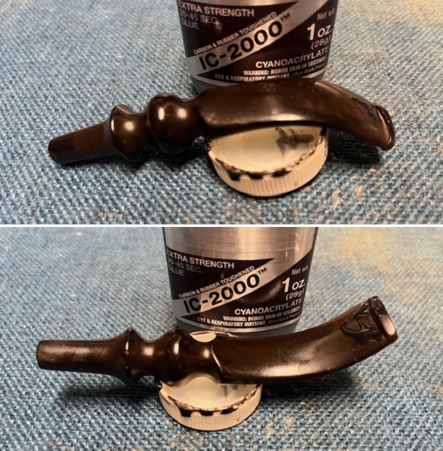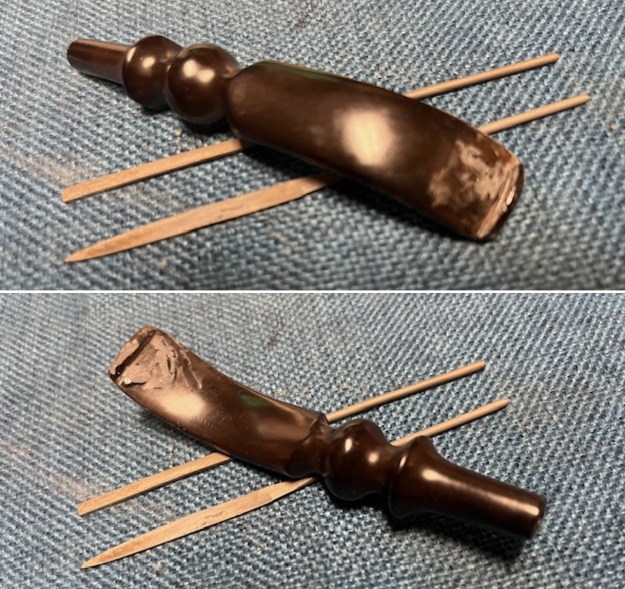 While I was working on the stem the white acrylic replacement tenon came out in my hand. It had not been glued in place in the stem so it easily slipped out. This was actually great because I wanted to replace it with a black tenon. I went through my Delrin tenons and found one that was perfect and looked more like the original. I fit it in the shank and to make sure it all fit together correctly.
