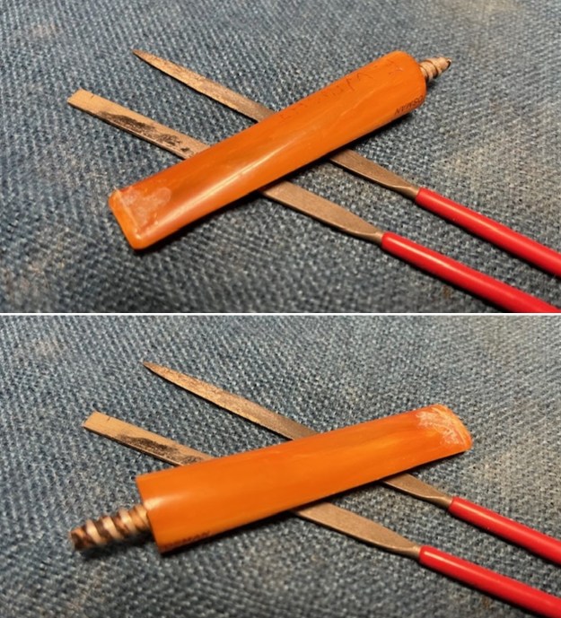 I sanded the stem and tenon surface with 320-3500 grit 2×2 inch pads. I wiped the stem down with an Obsidian Oil cloth after each sanding pad.