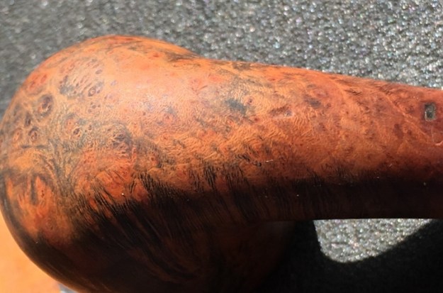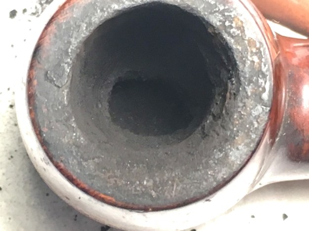 I took a photo of the bowl and rim top to show the cake in the bowl. The rim top looked to have a coat of lava overflowing down the crown with some possible damage around the inner edge. I took photos of the top and underside of the stem showing the light tooth chatter on the acrylic stem surface. The airway in the stem is also heavily stained with tars and oils.