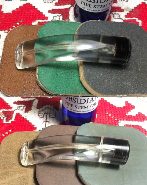 I polished the stem with micromesh sanding pads – dry sanding with 1500-12000 grit pads. I wiped the stem down after each sanding pad with Obsidian Oil. I polished the stem with Before & After Pipe Stem Polish – both Fine and Extra Fine. I gave it a coat of Obsidian Pipe Stem Oil. It works to protect the stem from oxidizing. I set it aside to dry.
