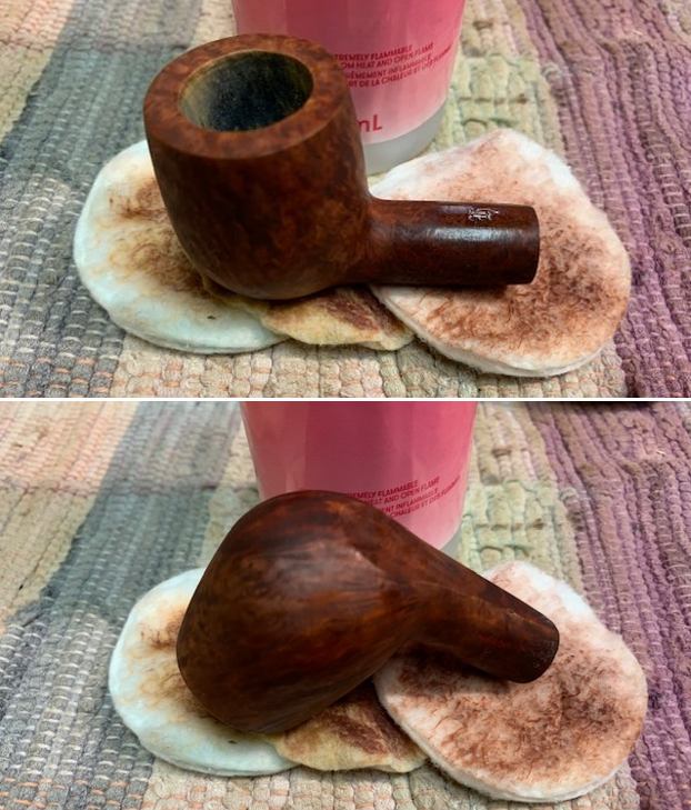Next, to clean the external surface of the carving, I use undiluted Murphy’s Oil Soap and scrub with a cotton pad and bristled tooth brush to get into the curves, nooks and crannies of the carving, I use as well a bristled brass wire brush to work on the lava and discoloration on the cap. I then rinse the stummel with cool tap water. The surface of the carving cleans up nicely as well as the rim/cap.