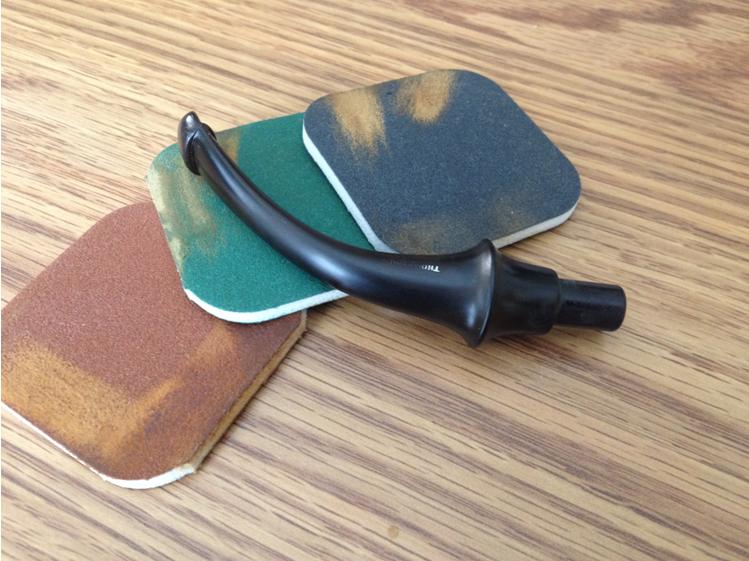 I sanded the stem with 320-3500 grit sanding pads to remove the tooth marks and chatter against the button edge and sand the logo. It worked well on the tooth marks but did little on the logo on the stem top.