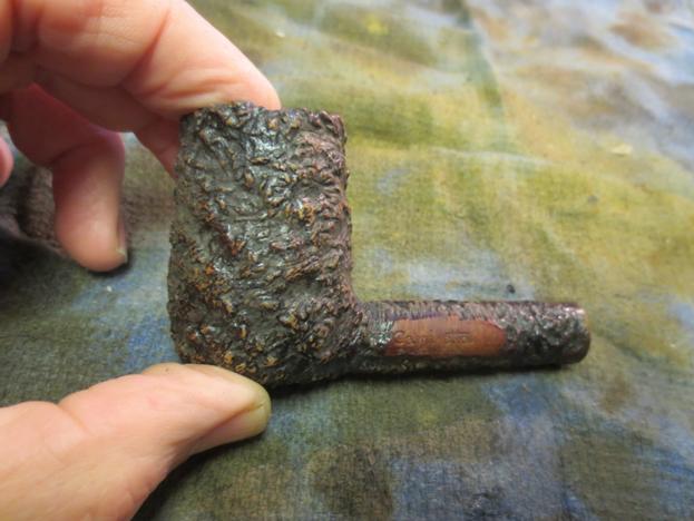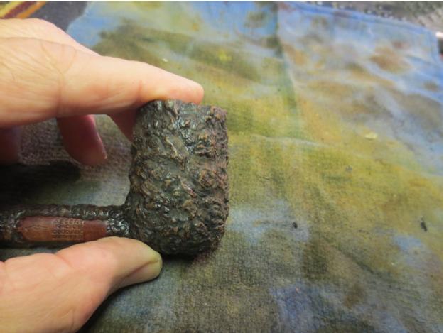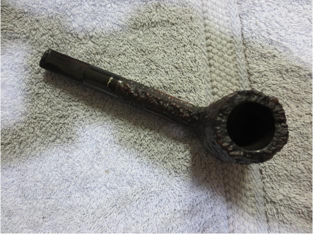 After about an hour and a half, I removed the stummel from the alcohol, worked one regular pipe cleaner (not bristled and not extra fluffy) through the shank and another through the bit, to dry the inside of the plastic and ensure no damage; stuffed a small soft cotton gun cleaner cloth into the chamber and scrubbed that area dryer while doing the same to the outer part of the wood. I took off the remaining stain with 320-grit paper.