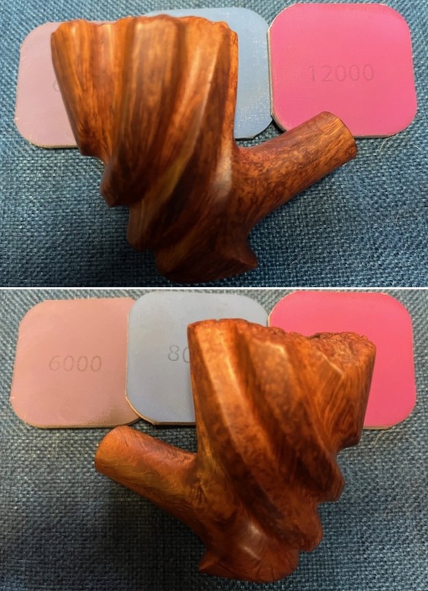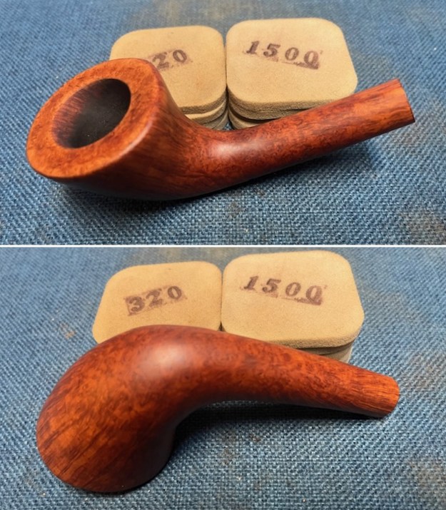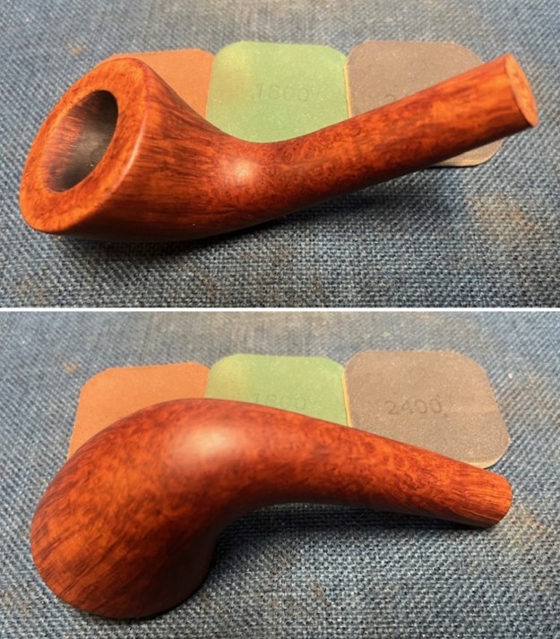 I wiped the bowl down with a damp cloth and sanded it with 320-3500 grit sanding pads to remove the surface scratches in the finish. I carefully avoided the stamping so as not to damage it. The briar began to have a rich shine and the bowl looked very good.