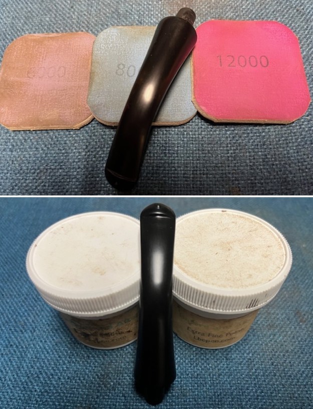 I polished the vulcanite with micromesh sanding pads – 1500-12000 grit pads. I wiped it down with Obsidian Oil after each sanding pad. I used Before & After Pipe Polish – both Fine and Extra Fine to further polish the stem.