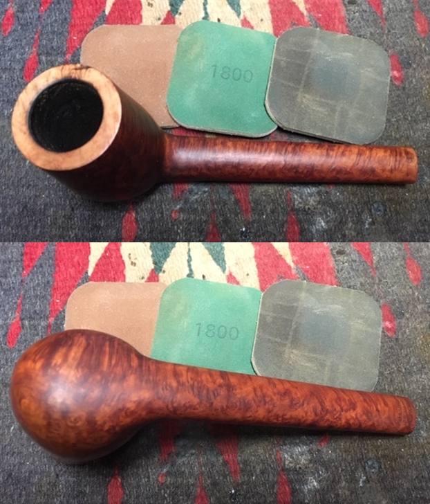 I decided to start my work on the pipe by addressing the darkening and damage to the rim top and edges. I topped the bowl on a topping board with 220 grit sandpaper to remove the damage and minimize the outer and inner edge damage. I was able to remove much of the damage. To address the gouge in the rim top on the right side I filled it in with clear super glue and continued the topping until it was smooth. I cleaned up the inner edge with a folded piece of 220 grit sandpaper to minimize the damage to the edge.