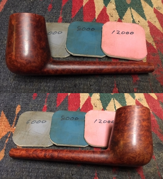 I polished the bowl sides and rim top with micromesh sanding pads. I wet sanded with 1500-2400 grit pads and dry sanded with 3200-12000 grit pads. I wiped the bowl and rim down with a damp cloth after each pad. As I polished it the sanded rim top began to shine and blend in with the rest of the briar. When I finished polishing the rim top I stained it with a Cherry stain pen to match the colour of the rest of the bowl.
