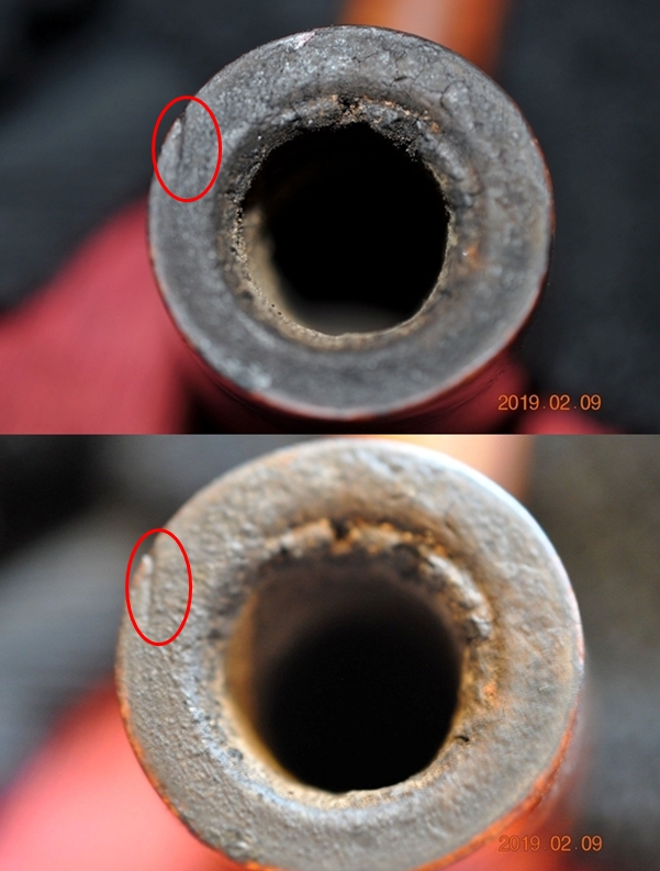 Jeff took photos of the bowl and rim to capture the condition of the pipe before he started his cleanup work. There was a thick coat of lava on the rim and the cake in the bowl. It shows the mess this pipe was in when we received it. The thick lava overflow on the rim top made it hard to know what the inner edges of the bowl looked like. The outer edge appeared to have deep gouge on the right side of the rim top. I have circled it in red to identify the issue. There is also a general accumulation of grease and grime ground into the finish on the rest of the bowl and shank.
