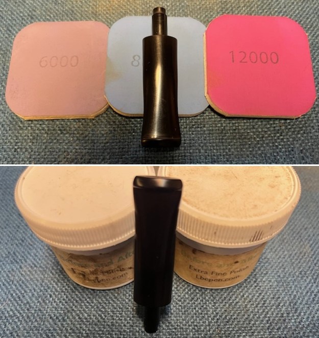 Looking at the stem in bright light I could see some oxidation starting mid stem going to the button. While the chatter and tooth marks were light the oxidation was quite deep and only visible in bright lights. I sanded the stem with 320-3500 grit sanding pads. I wiped the stem down with an Obsidian Oil cloth after each sanding pad. I think I finally beat the oxidation.