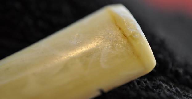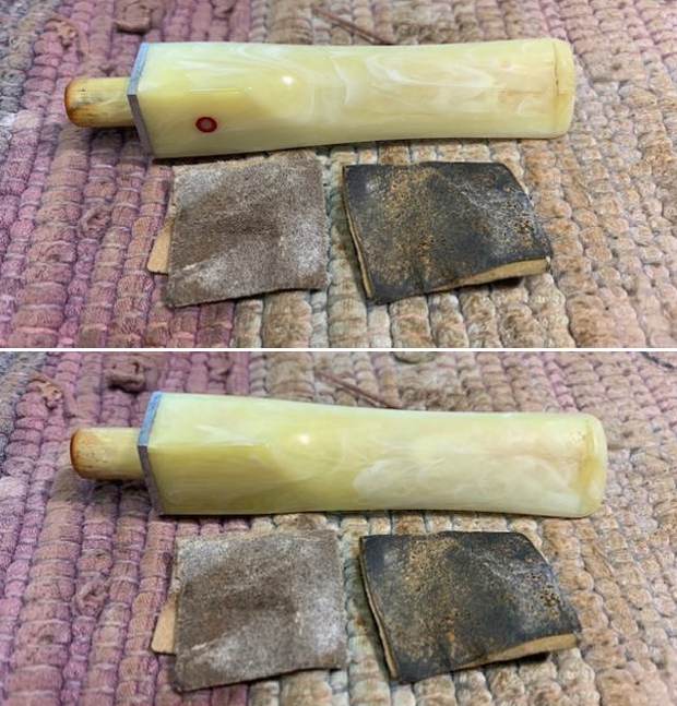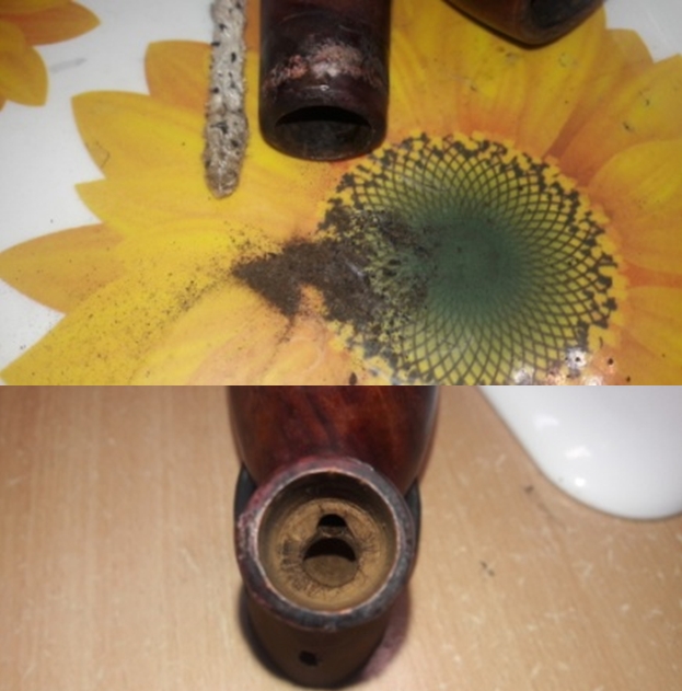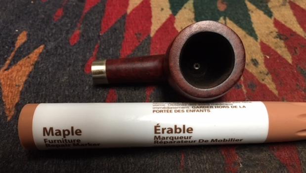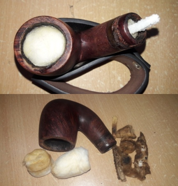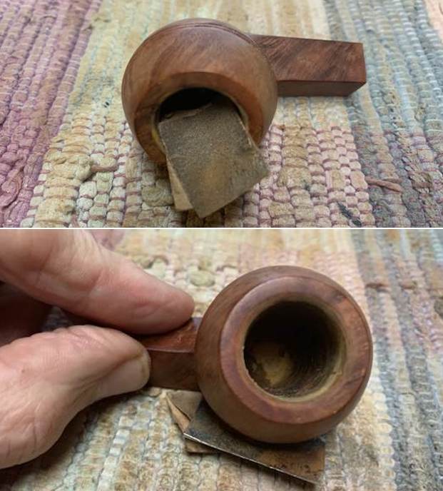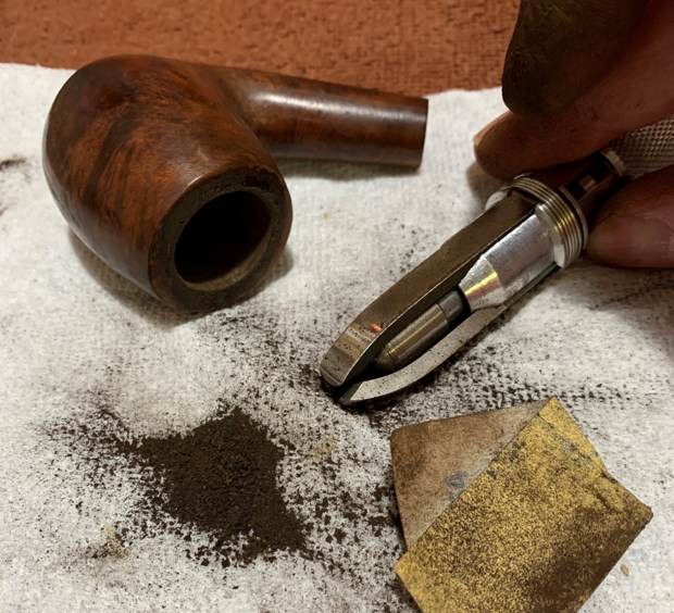 Now that the stem is (nearly) complete, I can move on to the bowl. The first step for me is to ream it – that is to say, remove all the cake inside the bowl. This accomplishes a couple of things. First (and most obviously), it cleans the bowl and provides a refurbished chamber for future smoking. Second, when the old cake is removed, I can inspect the interior walls of the bowl and determine if there is damage or not. I used a reamer and a piece of sandpaper taped to a wooden dowel. Collectively, these ensure that all the debris is removed. To my surprise, the walls were in decent shape, but, as I mentioned earlier, there were tiny cracks in the base of the bowl.