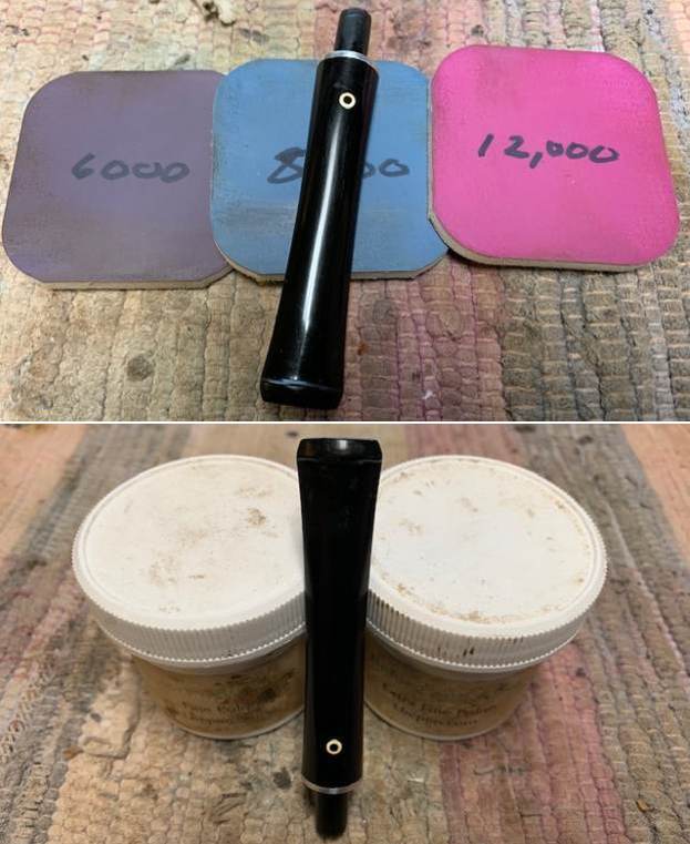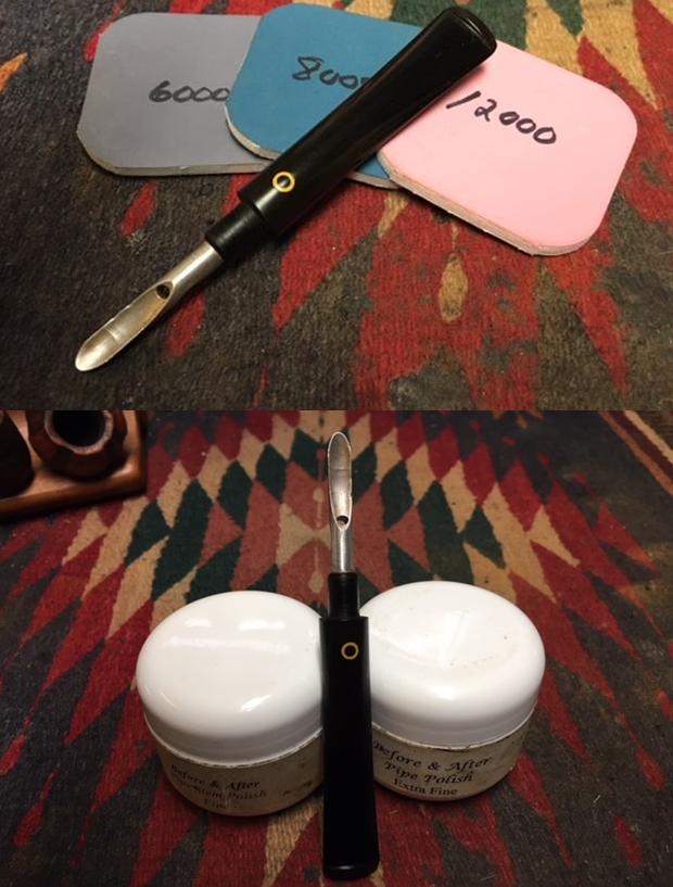 The penultimate step for the stem is sanding. First, with my set of needle files, I reduce the bulk of the cyanoacrylate repairs. I want to remove the excess adhesive as near to the surface as possible, without cutting into the nylon. Following that, I use all nine of the micromesh sanding pads (1,500 through 12,000 grit) to sand out flaws, even out the nylon, and provide gentle polishing of the finished surface. I also apply pipe-stem oil while using the last five micromesh pads. There was a wonderful, deep black shine to the stem when I was done, but I had to do this whole process twice, as I wasn’t happy with the initial results.