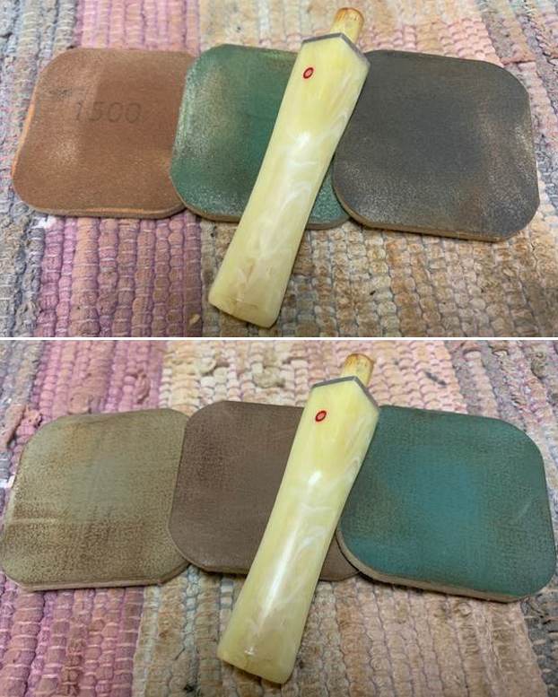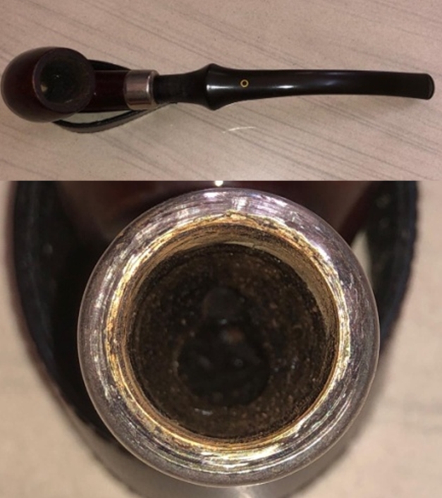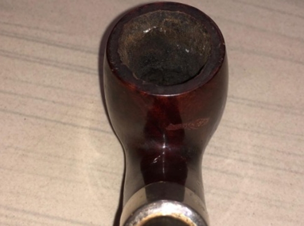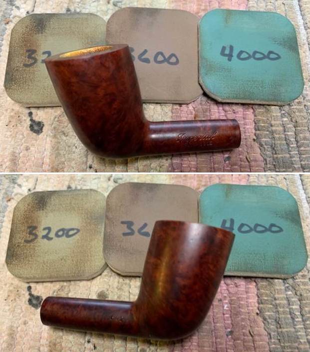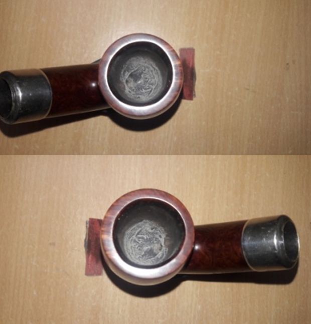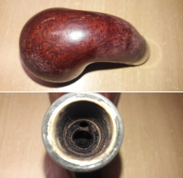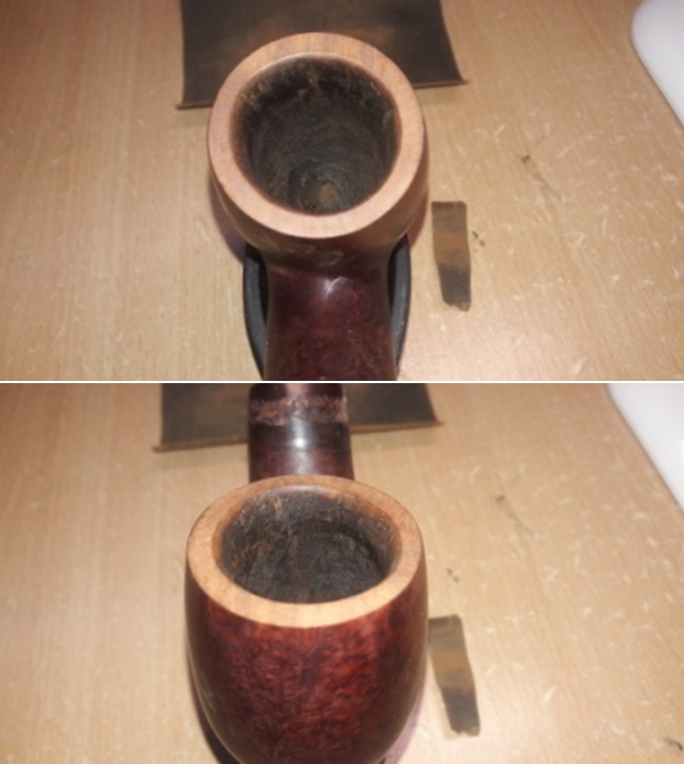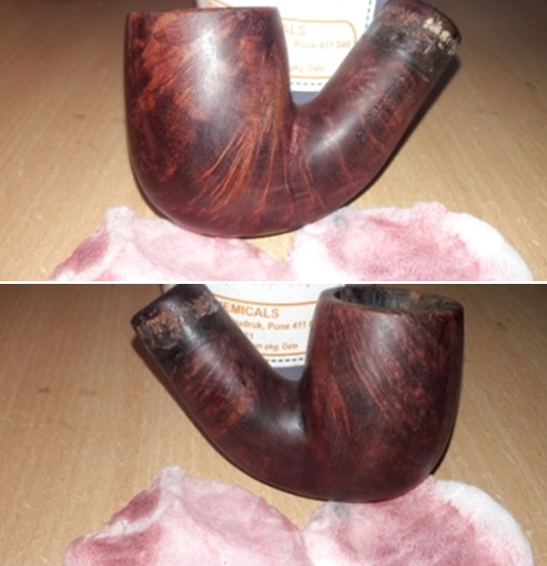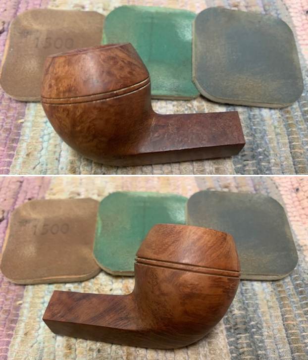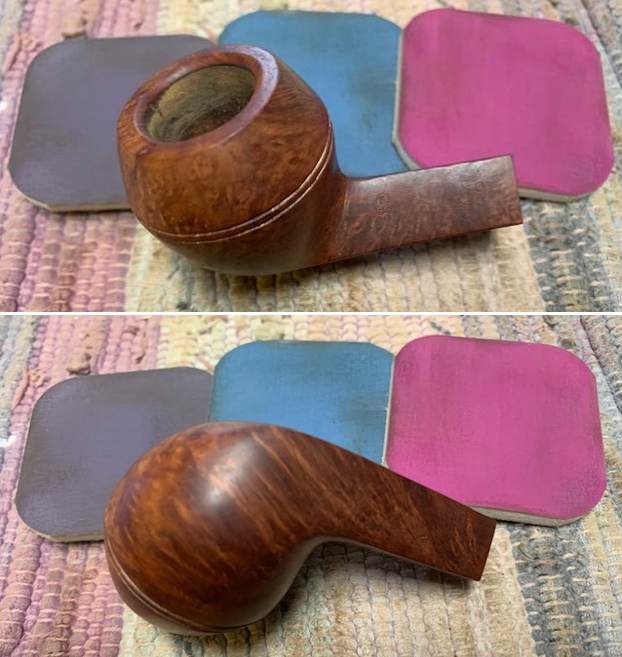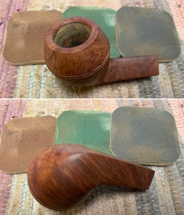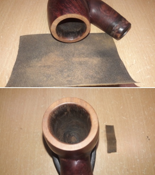 The damage to the rim is significant. In order to lessen (but not eliminate) the nicks on the rim, I ‘topped’ the pipe – that is to say, I gently and evenly sanded the rim on a piece of 220-grit sandpaper. This effectively minimizes the damage, without altering the look of the pipe. There will always be some sign of the wound on the rim, but, as I’ve said before, it is part of the pipe’s history.