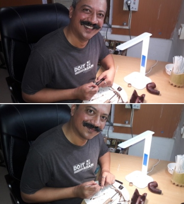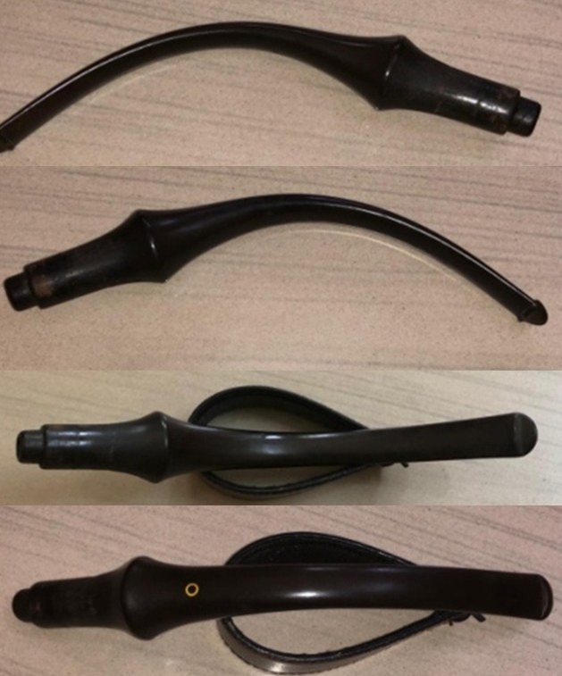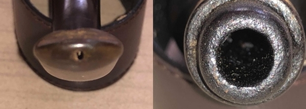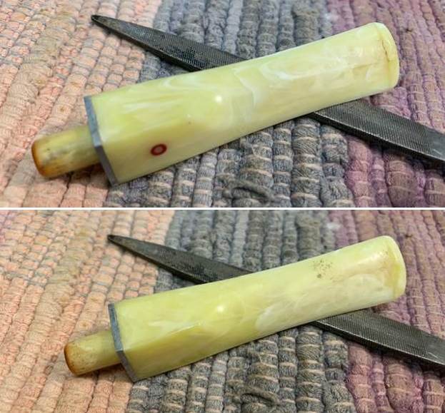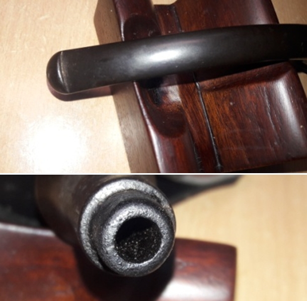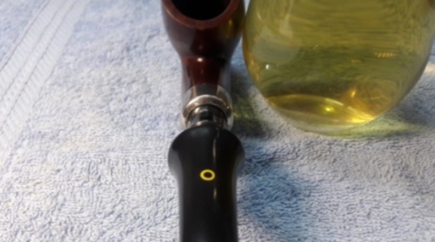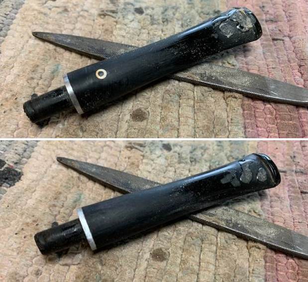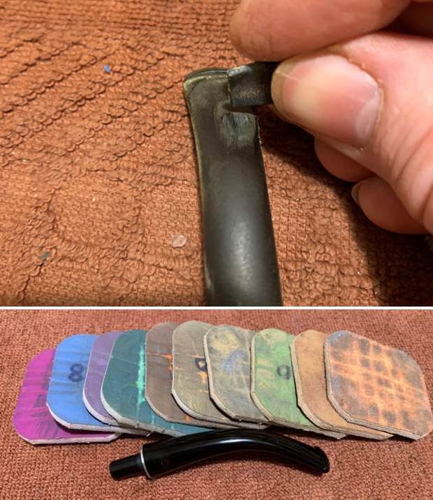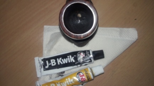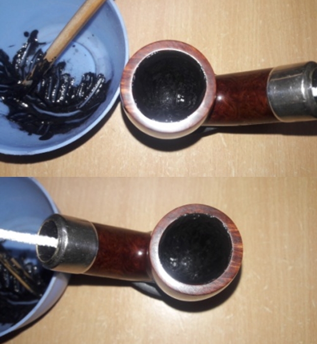 Let’s begin with the stem. As it is made of nylon, there was no oxidation – and no oxidation means no need for deoxidation fluid. I used 99% lemon-infused isopropyl alcohol on a few cotton rounds and scoured the stem. Then, I cleaned the inside of the stem with pipe cleaners dipped in the alcohol. I scrubbed thoroughly to make sure the interior was clean. I used ‘zillions’ of pipe cleaners for this stem. Now that the stem is clean and dry, I set about fixing the marks and dents in the nylon. This was done by filling those divots with black cyanoacrylate adhesive, impregnated with carbon and rubber. This took a lot of work (and more than one try) to get right. I left this to cure and moved on. Sorry – I neglected to take a photo of this step.
