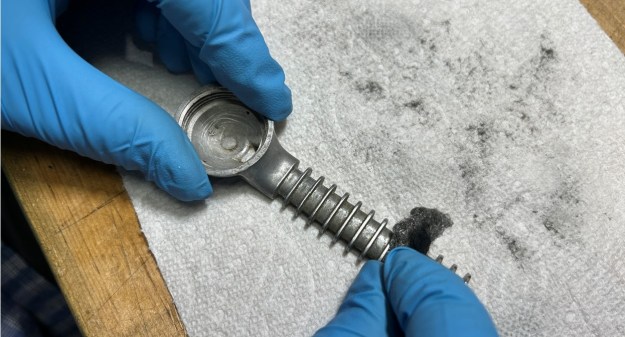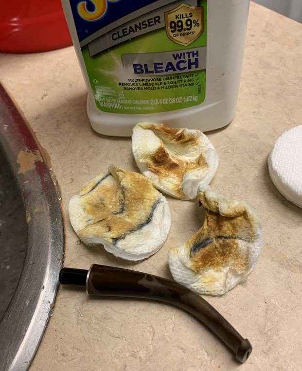 I’ve done the nylon, I’ve done the briar – now on to the two pieces of aluminum: the shank and the grate. As both were so dirty, I decided to drop them in an isopropyl alcohol bath and let them sit overnight. This accomplished precisely nothing. I then used my technique from above and dropped both bits in acetone for a while. This worked much better! A lot of filth came off. With that inspiration, I took both pieces to the sink and scrubbed them inside and outside with my cream cleanser. Now we’re getting somewhere! Over the next little while, I used several tools with acetone etc. to get into all the nooks and crannies in order to really clean everything well.