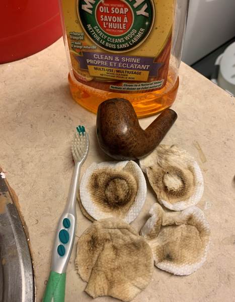 To tidy up the briar, I also wiped down the outside with some oil soap on cotton rounds (and a toothbrush). This does a good job of cleaning any latent dirt on the surface of the briar. One of the difficulties in maintaining an Airograte Yello-Bole is that the wooden threads of the bowl are impregnated with the awful filth at the bottom of the metal shank. I used a brass-wire brush, a dental tool, and a small butter knife to try and clean things up. This didn’t help much. So, the next step of the cleaning process was to scour the inside of the bowl with some soap and tube brushes. This also didn’t help the base much.