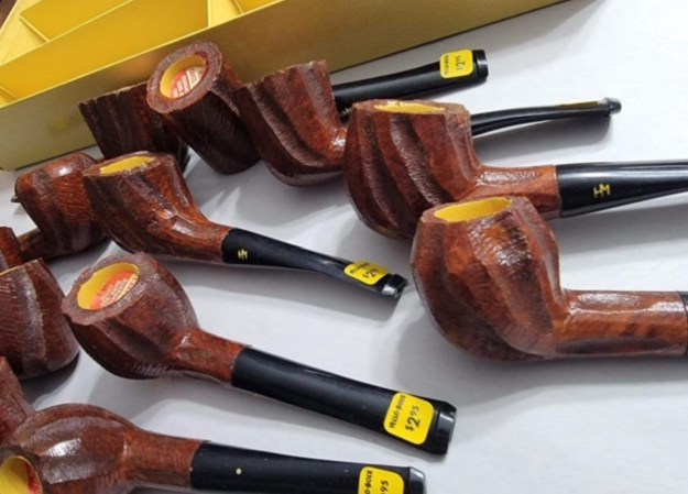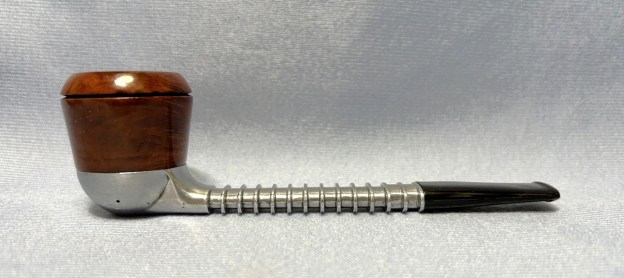 The Yello Bole Aristocrat Airograte: An Aluminum and wood pipe with a twist. This pipe doesn’t have a bowl per say, but more a briar cylinder that screws into the base of the body. At the bottom of the bowl is a metal grate, thus allowing air to be pulled through all the tobacco and reducing any chance of clogging. The lower bowl catches all moisture and tar reducing bite. These pipes can be had in a silver/chrome finish as well as a soft gold finish. The stem of these pipes has cooling fins up each side, and can be found in a straight or bent form.